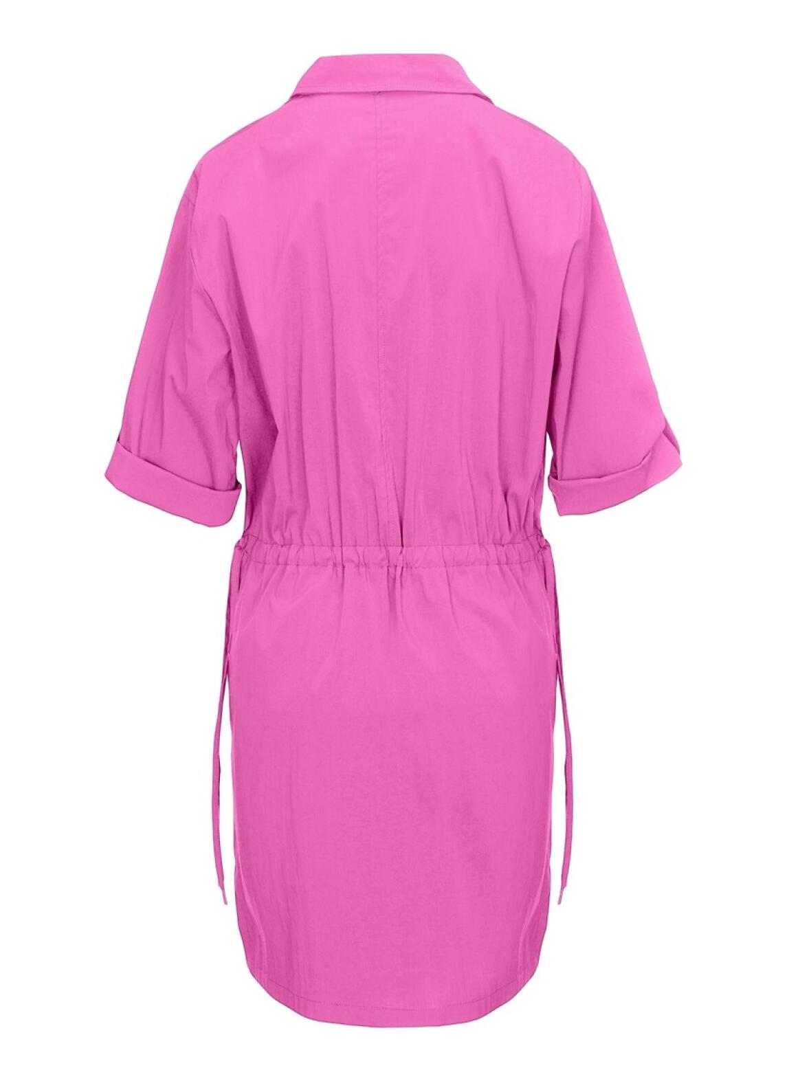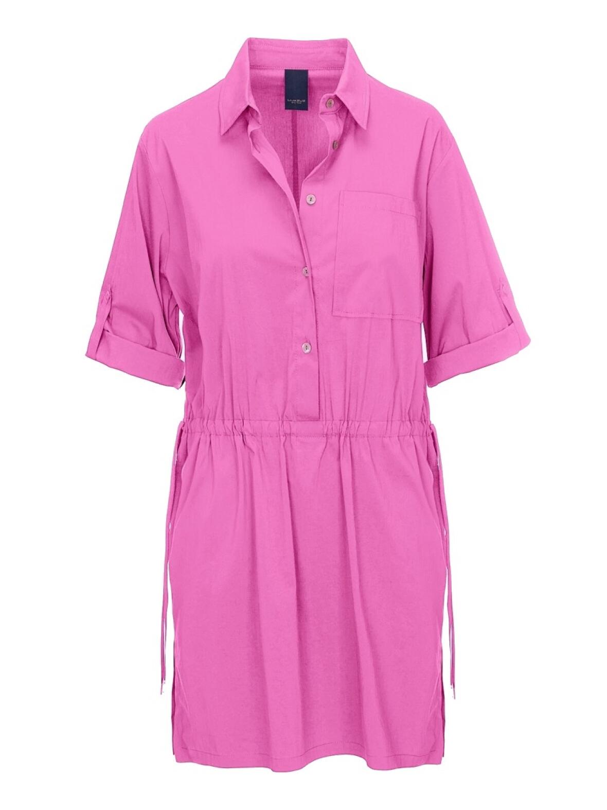 Marchella skjorte kjole fra One Two Luxzuz i hot pink farve. Kjolen har flip krave, stolpelukning ned til taljen og snøreeffekt i siderne som kan trækkes til i taljen. Sidelommer og lille slids i begge sider. Ærmerne er trekvarte og kan foldes op til kort ærme og hæftes med en strop. En enkelt påsat brystlomme i ventre side. 95 % bomuld og 5 % elastan. Vask ved 40 grader. Max krymp 5 %.