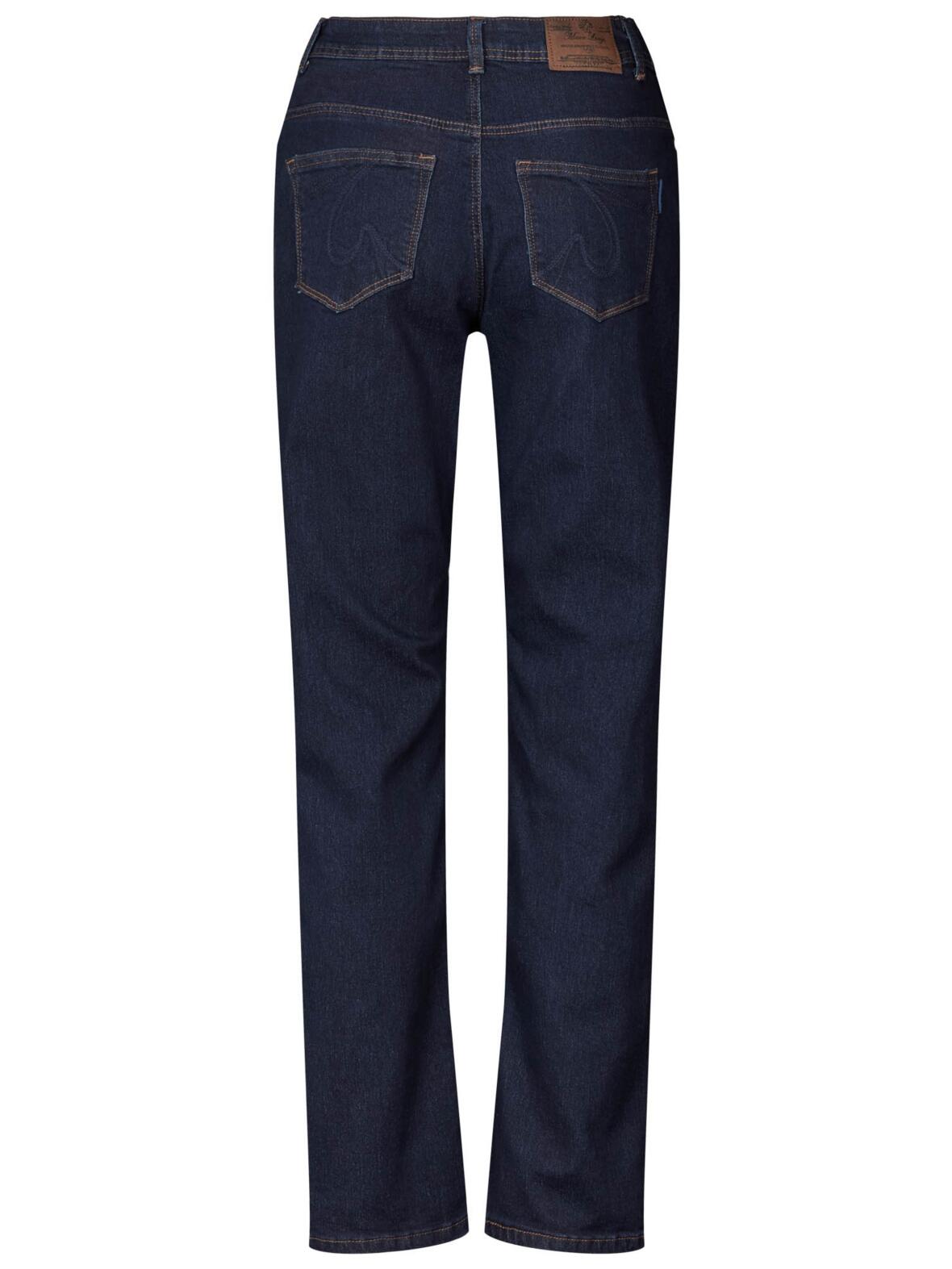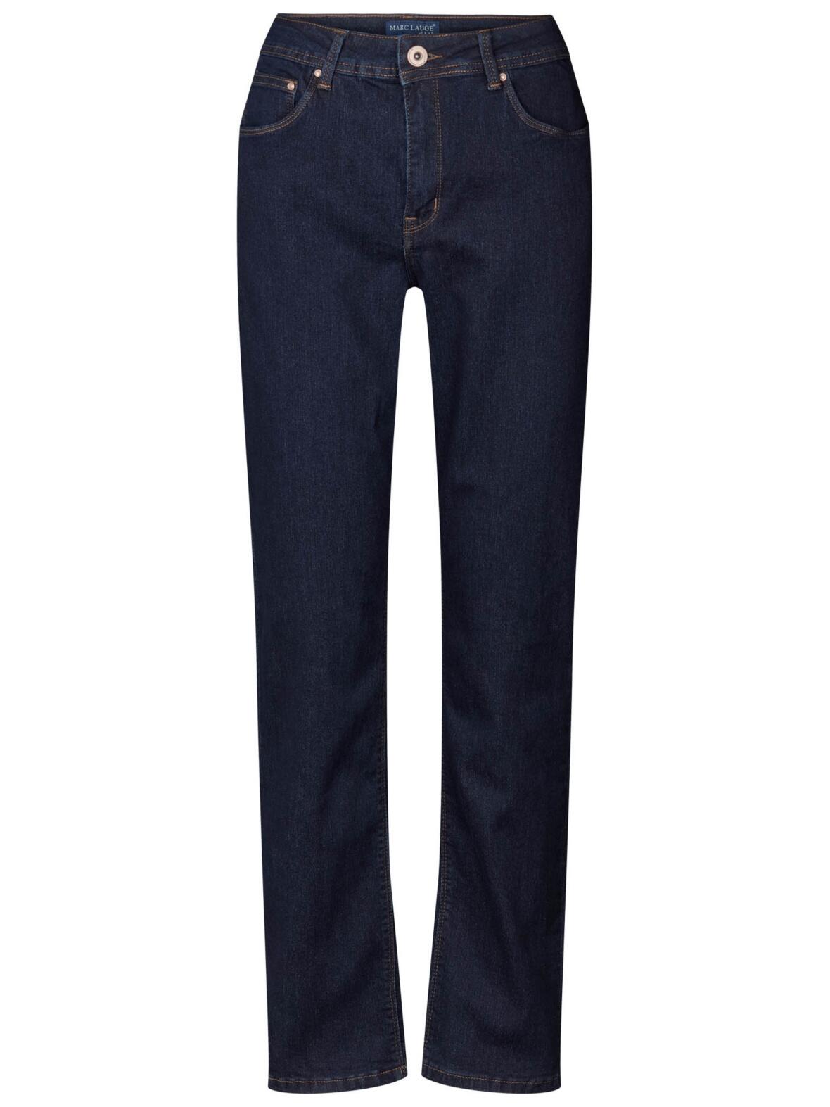 Marc Lauge Carmen jeans i mørk blå denim vask uden slid. Buksen har mørke brune stikninger og guld knap og guld nitter. Modellen er højtaljet, har god plads over hofter og lår og har lige ben med lidt vidde.72 % bomuld, 26 5 polyester og 2 % elastan. Vask ved 30 grader.