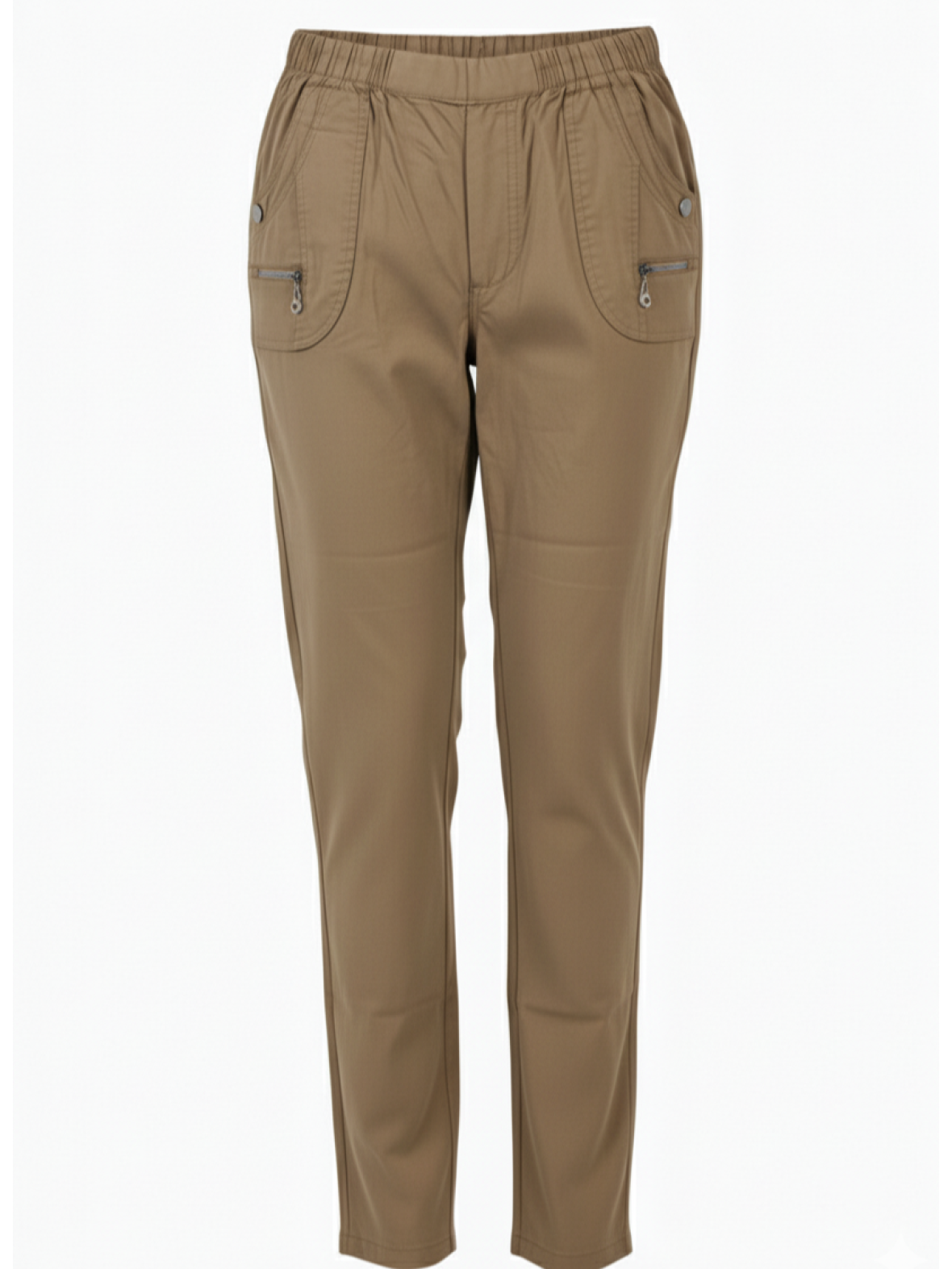 Mørk sandfarvede Vanting bingo bukser med polar foer på bagsiden. Buksen har elastik i taljen på nær lige midt foran, hvor linning er flad. Påsatte lommer med lidt lynlås pynt foran og moderat benvidde. 77 % viscose, 19 % polyamid og 4 % elastan. Vask ved 30 grader.