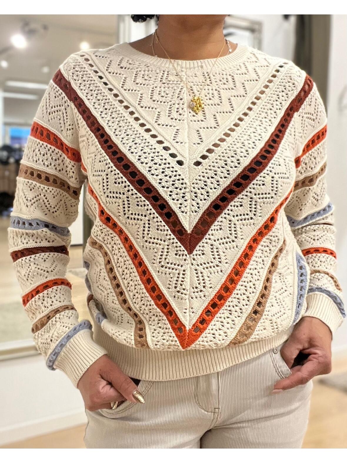 Red Button Sweet Ajour strik bluse med lange ærmer og rund hals. Blusen har retro look og er i beige strik med hulmønster og striber i rødbrun, orange, sand og lyseblå der går ned i V både foran og bagpå. Striberne går igen ud på ærmerne. Let oversize facon. 60 % bomuld og 40 % akryl. Vask ved 30 grader.