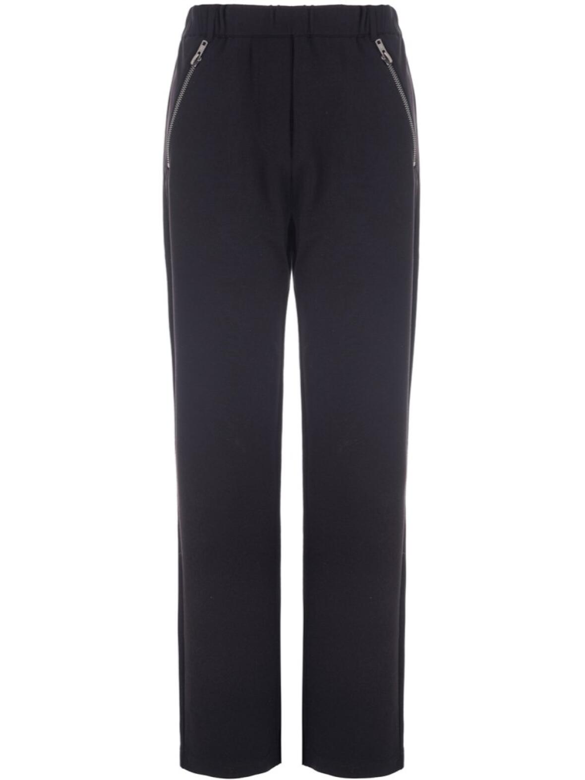 - Detaljer: Bred elastik i taljen, skrålommer med grov lynlås foran, enkelt paspoleret baglomme, bæltestropper, moderat smalle ben