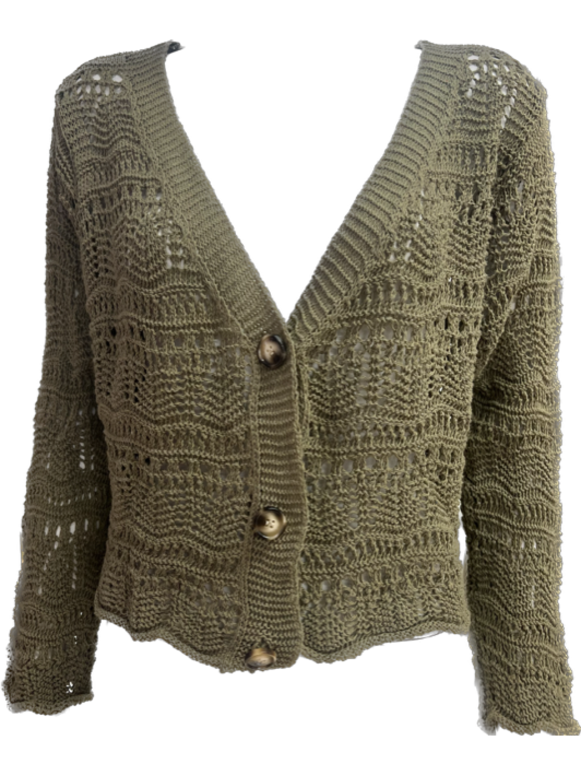 Army grøn kort Lisbeth Merrild strik cardigan med v-udskæring og lukning med 3 knapper ned foran. Fint strikket mønster med huller og borter. 100 % bomuld. Vaskes ved 30 grader.