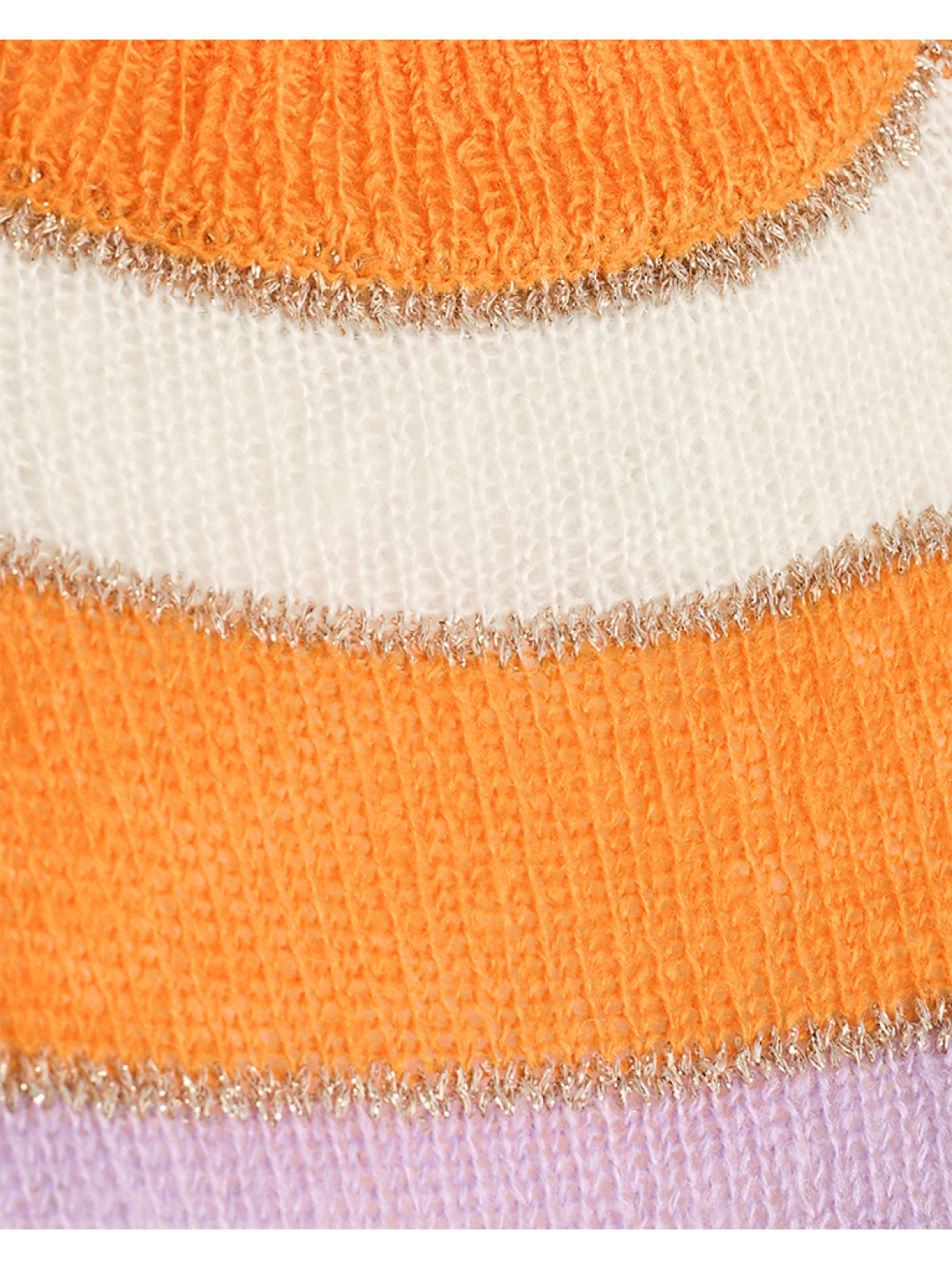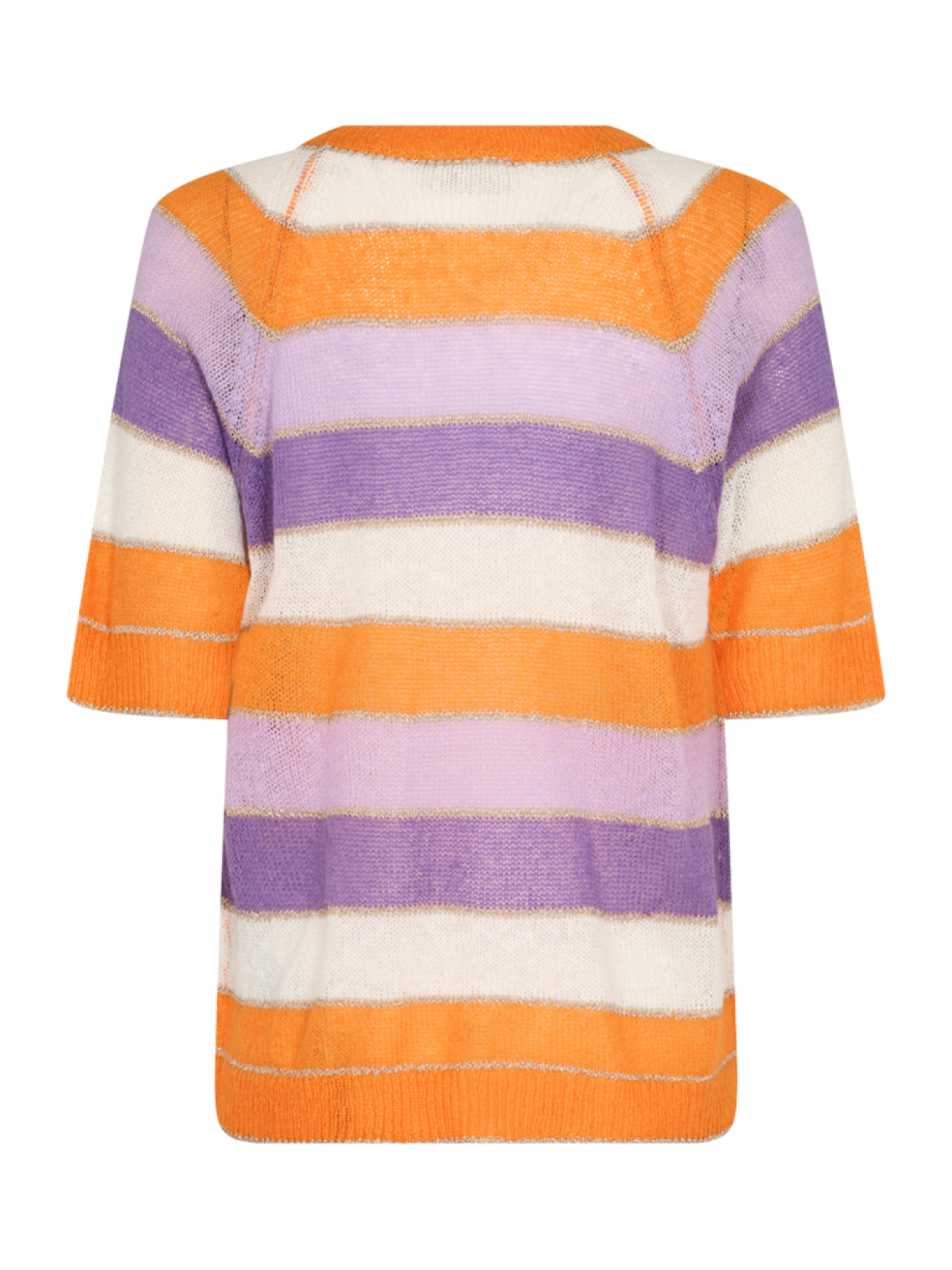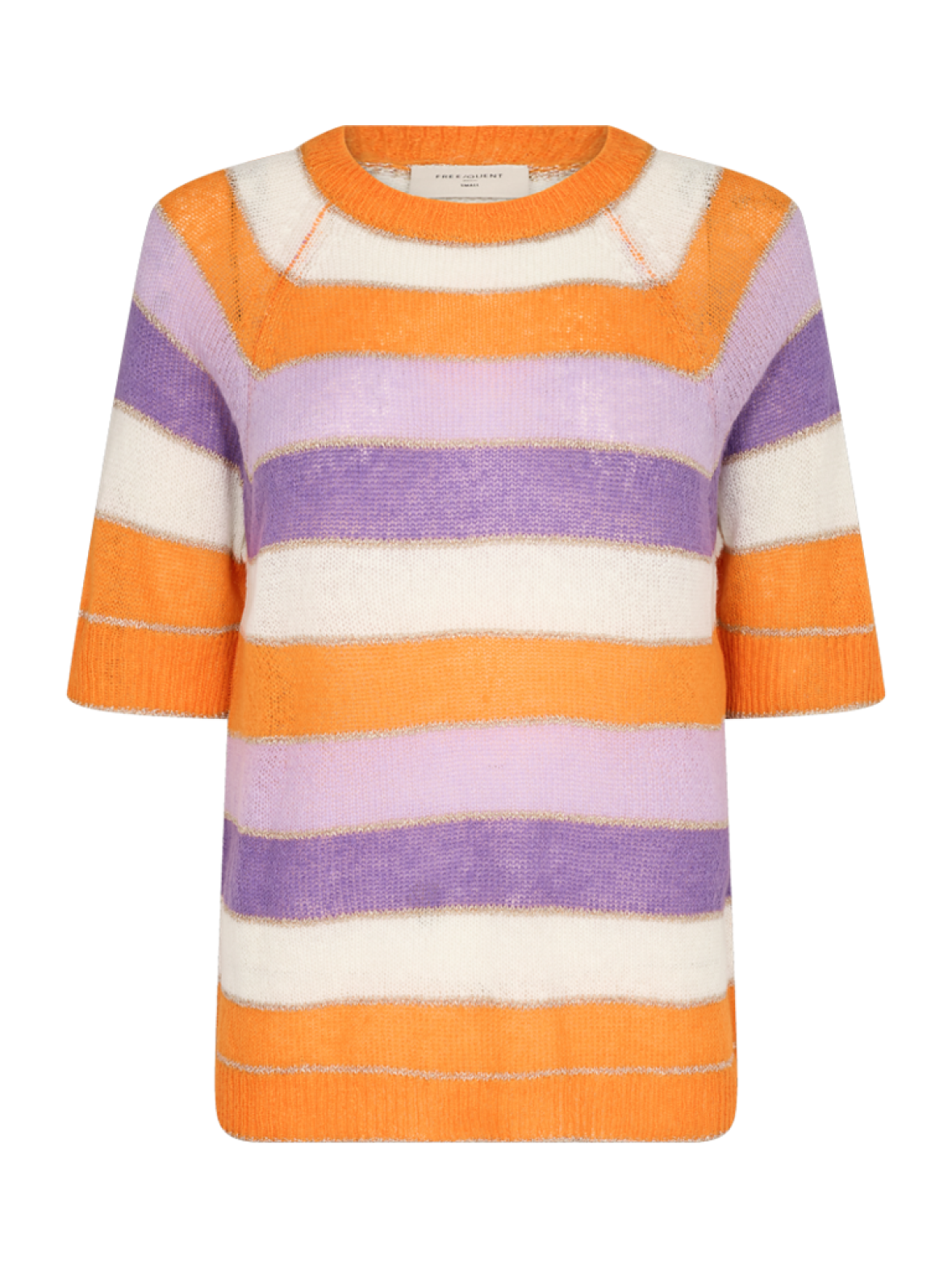 Freequent Clain kort ærmet strik bluse. Blusen har rund hals med ribkant og raglan ærmer med ribkantog smal ribkant forneden. Let strik stribet i skappe farver i lillla. lavendel, orange og hvid. Mellem striberne er der lurix striber. 53 % akryl, 32 % polyamid, 10 % uld, 3 % lurix og 2 % mohair. Vask ved 30 grader.