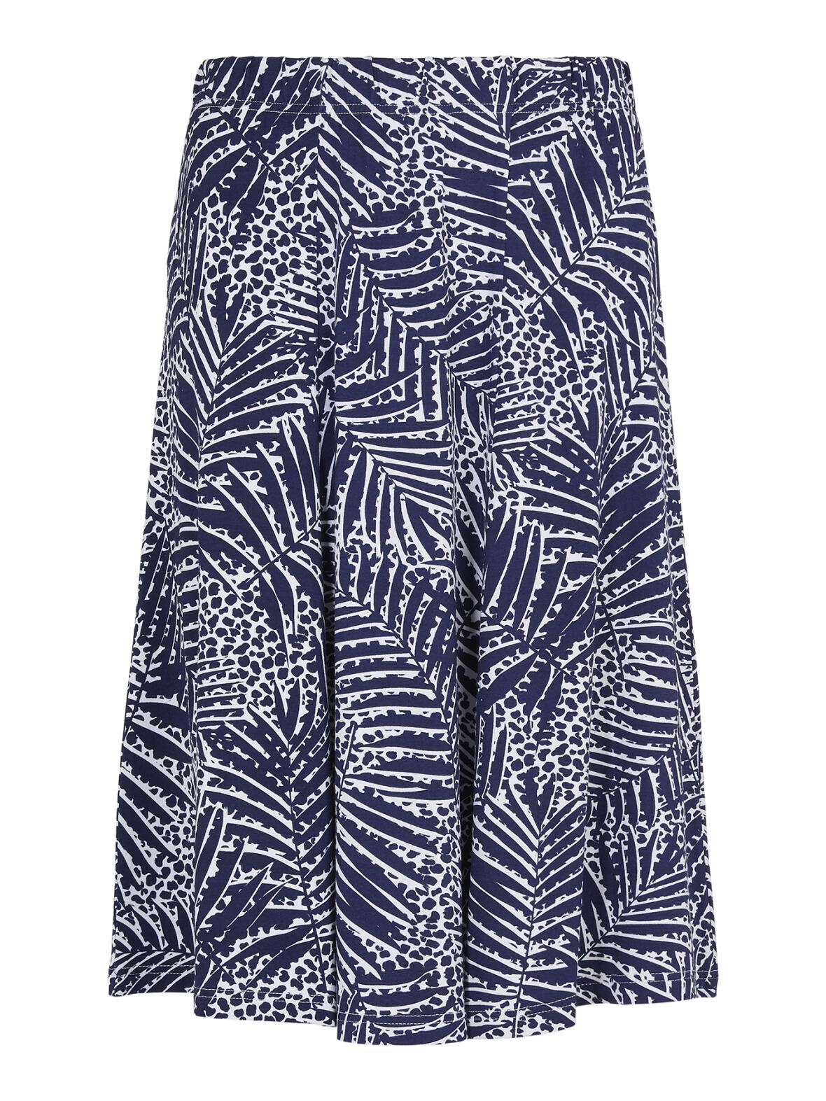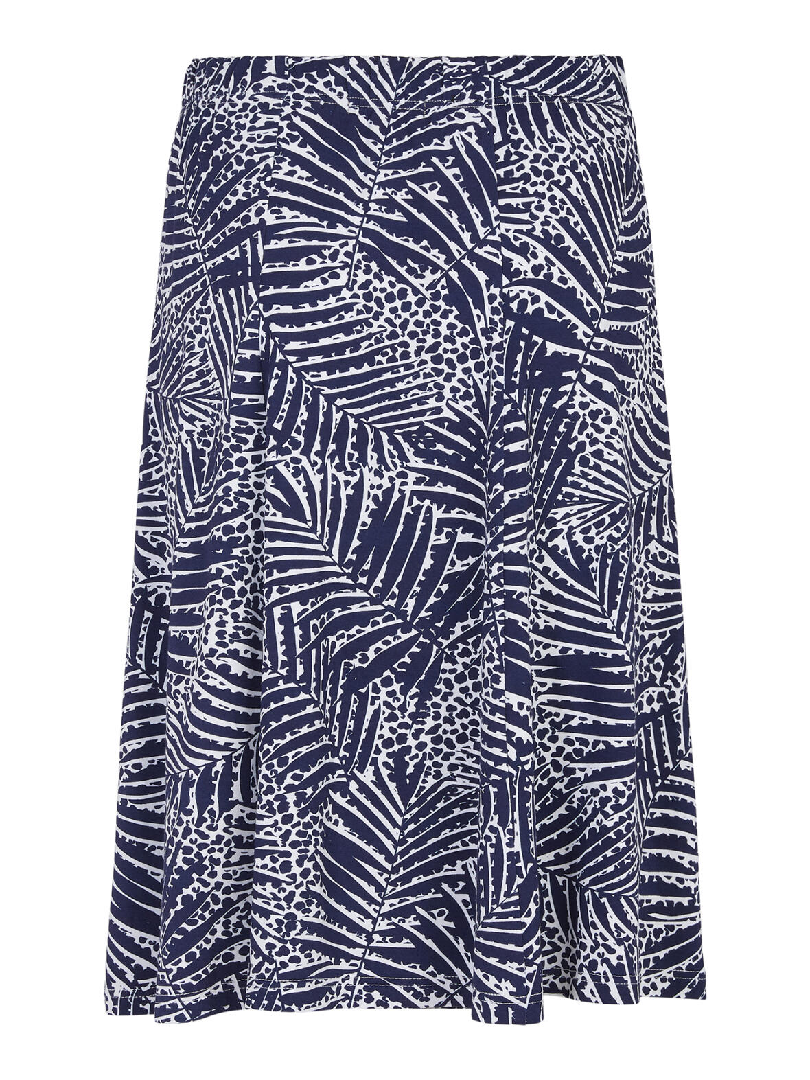 Sunday klassisk nederdel med elastik i taljen, skåret med paneler så der gradueret er let vidde i nederdelen. Lækker viscose jersey i flot bregne print i marine blå på hvid bund. Længden er 68 cm i str. L. 95 % viscose og 5 % elastan. Vask ved 30 grader.