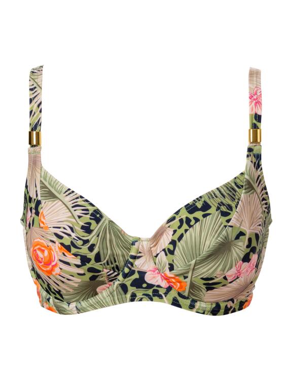 Trofè Monaco bikini overdel med bøjle og regulerbar stropper. Skålene er uden foer. Blomstret print i grønne, beige, orange og rosa farver. 82 % polyamid og 18 % elastan. Håndvaskes.