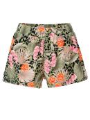Trofè badeshorts i flot stor blpmstret print i grøn, orange, rosa og beige farver. Shortsen har bred elastik i taljen og lidt vidde i benene. 82 % polyamid og 18 % elastan. Håndvaskes.