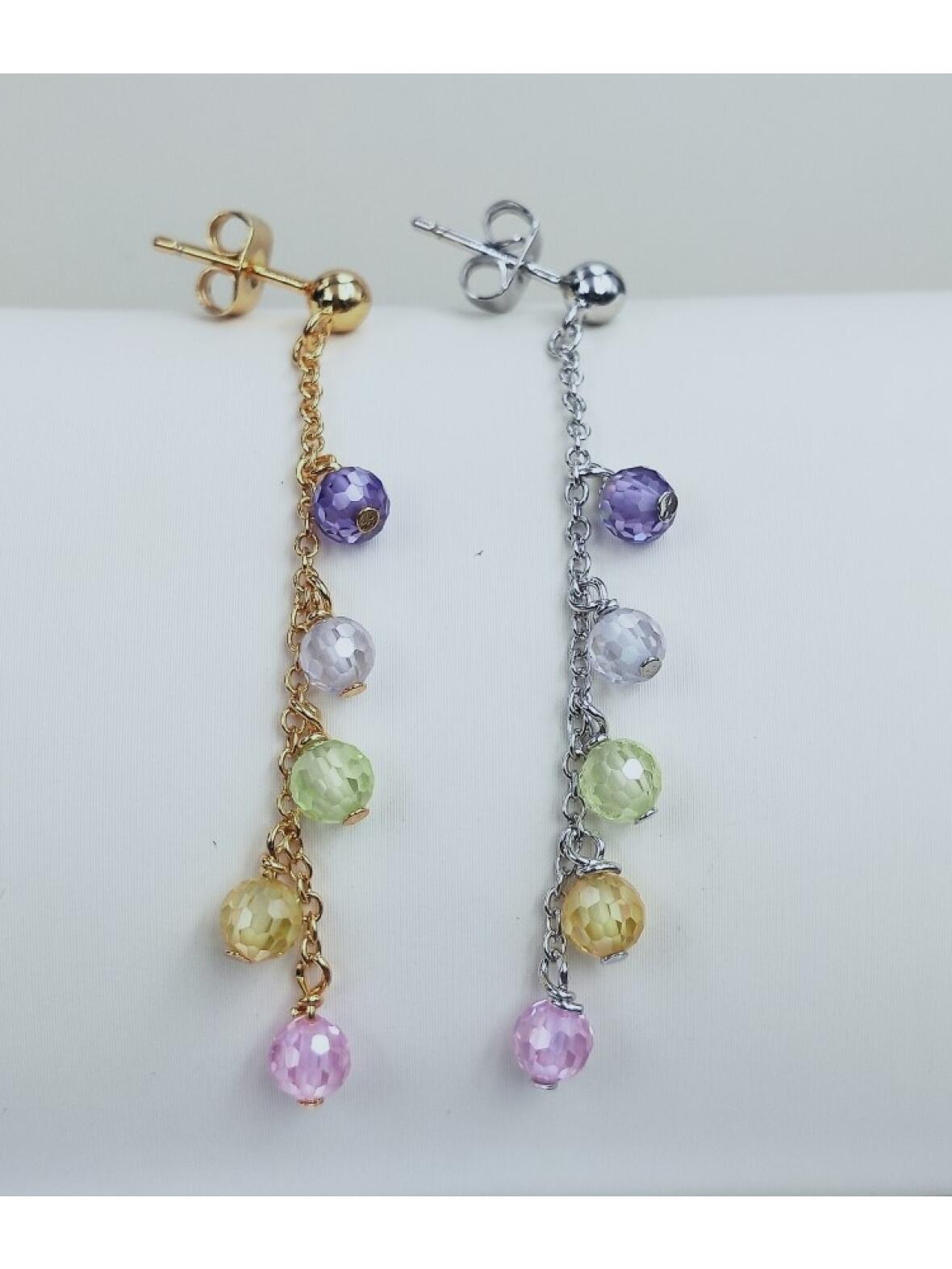 Three M ørestikker med guldfarvet kugle og en lænke på 5 cm derfra med små farvede perler.