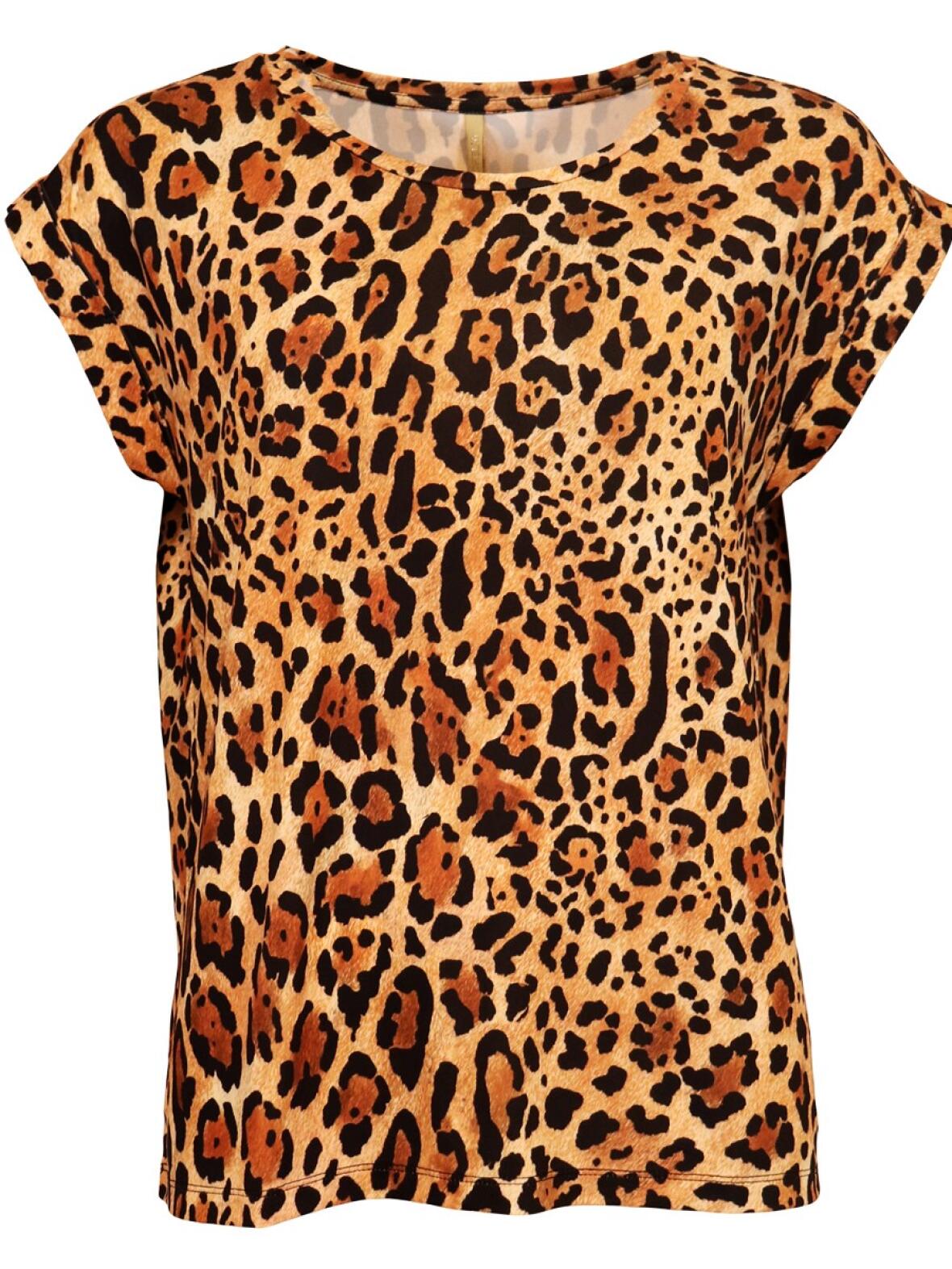 Ofelia Anick bluse med kort vingeærme med opsmøg, rund hals og regulær løs facon. Blusen eri dyreprint i lys camel og sort. Microfiber kvalitet som ikke krøller eller forandrer sig. 95 % polyester og 5 % elastan. Vask ved 30 grader.