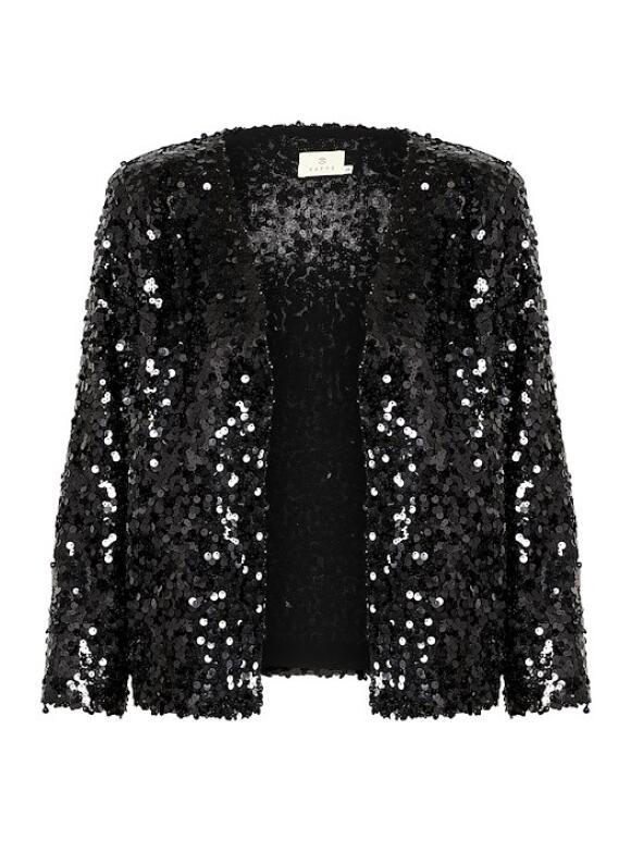 Sort Luisa palliet jakke fra Kaffe. Jakken er åbenstående og uden krave. Lange ærmer og små skulder puder. 100 % polyester. Vask ved 30 grader.