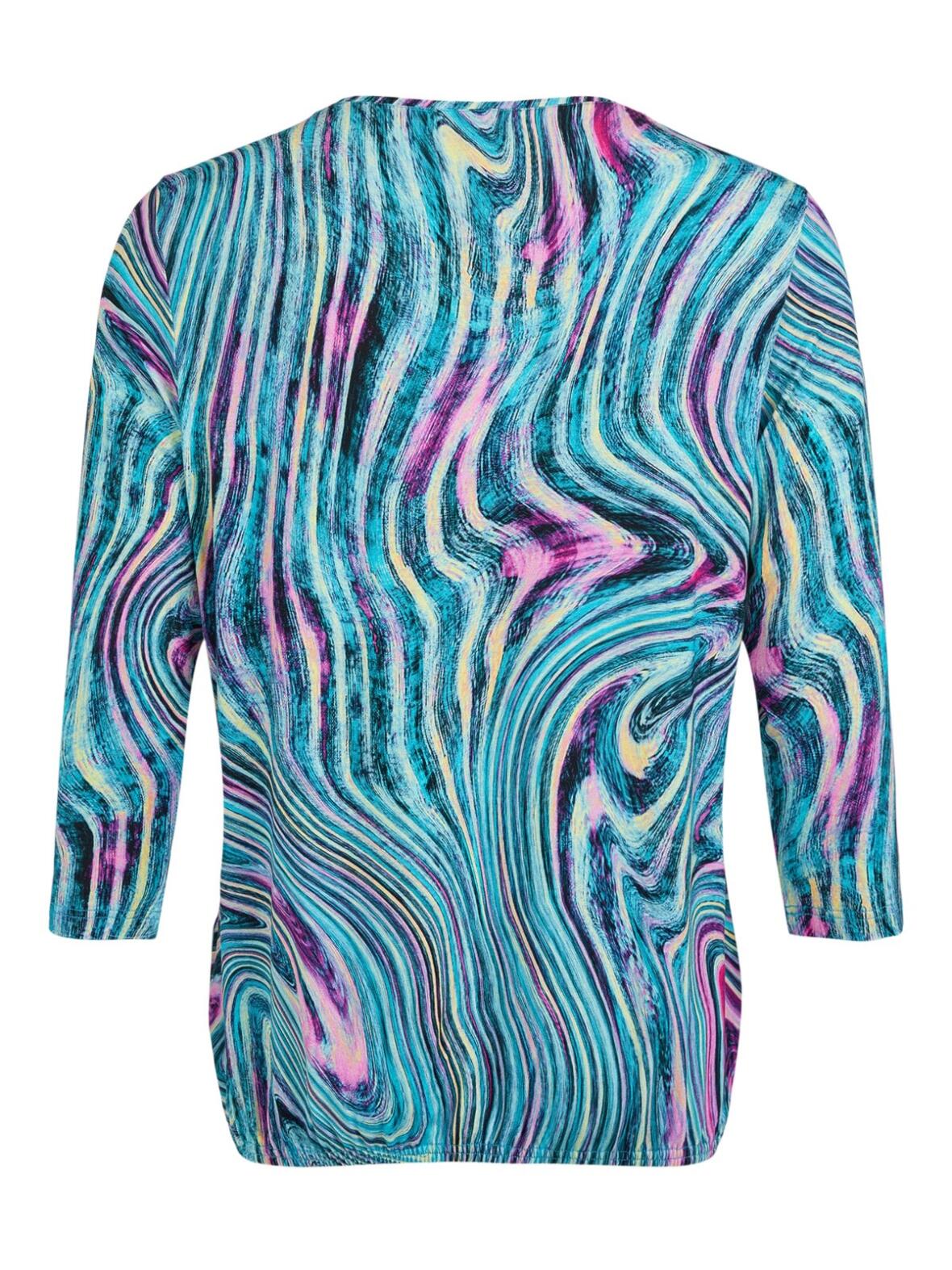 Sunday elastik bluse med rund hals og trekvart ærmer. Blusen har en rigtig god facon med lidt plads over maven og med mulighed for selv at regulerer længde med elastikken. Smukt abstrakt print i turkis, pink, blå, gult og lavendel. 95 % viscose og 5 % elastan. Vask ved 30 grader.