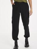 Sorte Eda cargo bukser fra Kaffe. Buksen har fast linning med knaplukning, skrålommer og snyde paspoleret baglommer. Lavsiddende lårlommer med klap og knaplukning. Buksen har elastik forneden i benene. Let og lækker kvalitet i 63 % polyester, 34 % viscose og 3 % elastan. Vask ved 30 grader.
