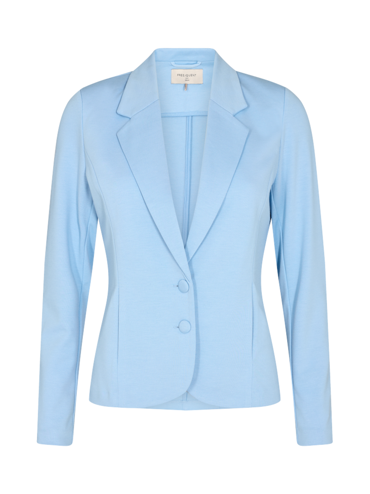 Freequent Nanni blazer i flot lyseblå. Klassisk facon med revers og lange ærmer Lukkes med to knapper foran og har små lodrette lommer foran. Blazeren er i blød jersey kvalitet og uden foer. 73 % polyester, 24 % viscose og 3 % elastan. Vask ved 30 grader.