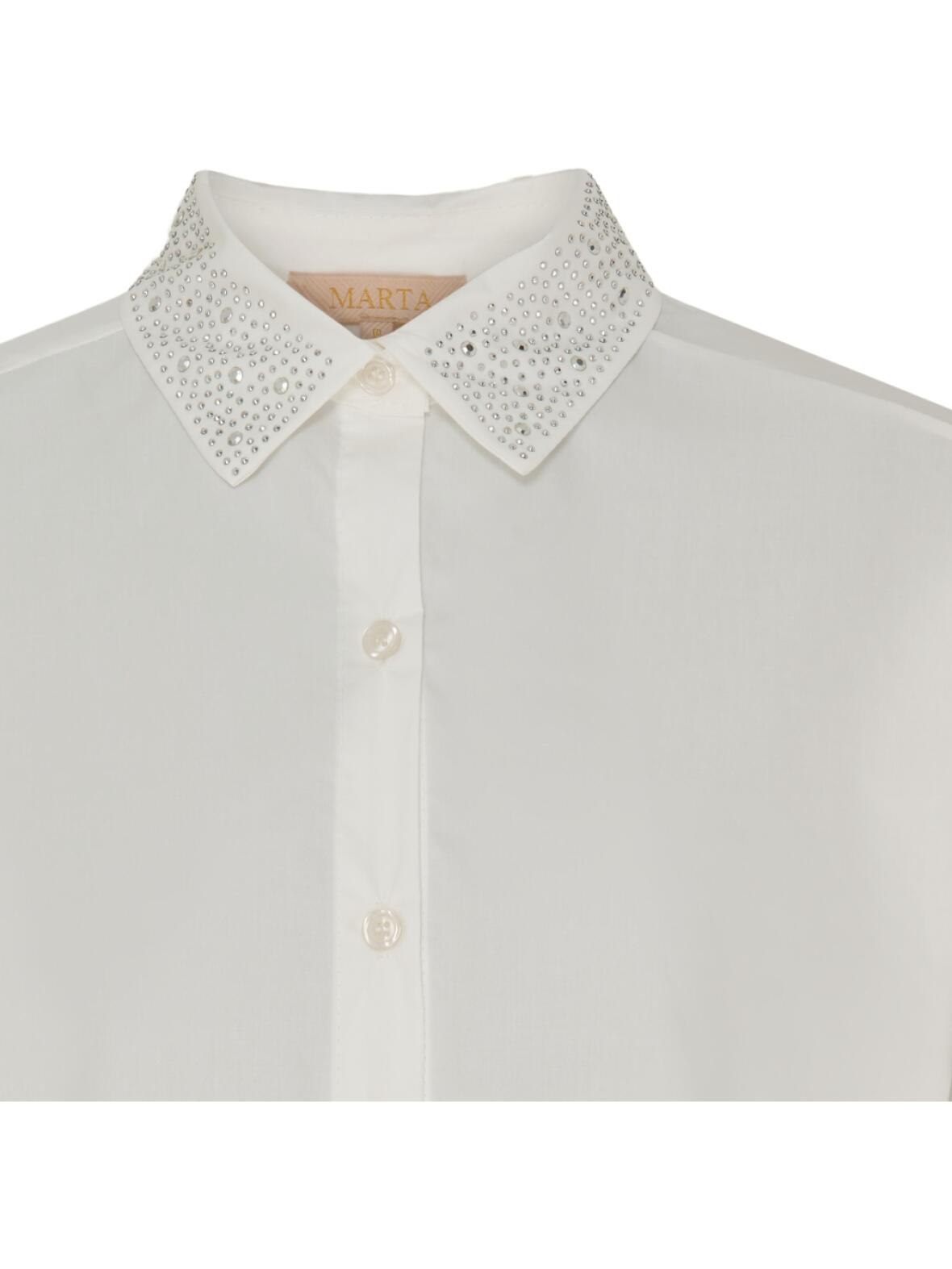 Tammi skjorte fra Marta Du Chateau. Klassisk skjorte model med flipkrave og lange ærmer med manchet og knaplukning. Skjorten er offwhite og har rhinsten på kraven og på manchetterne. Skjorten er i to størrelser. S/M brystmål 108 cm og L/XL 120 cm.