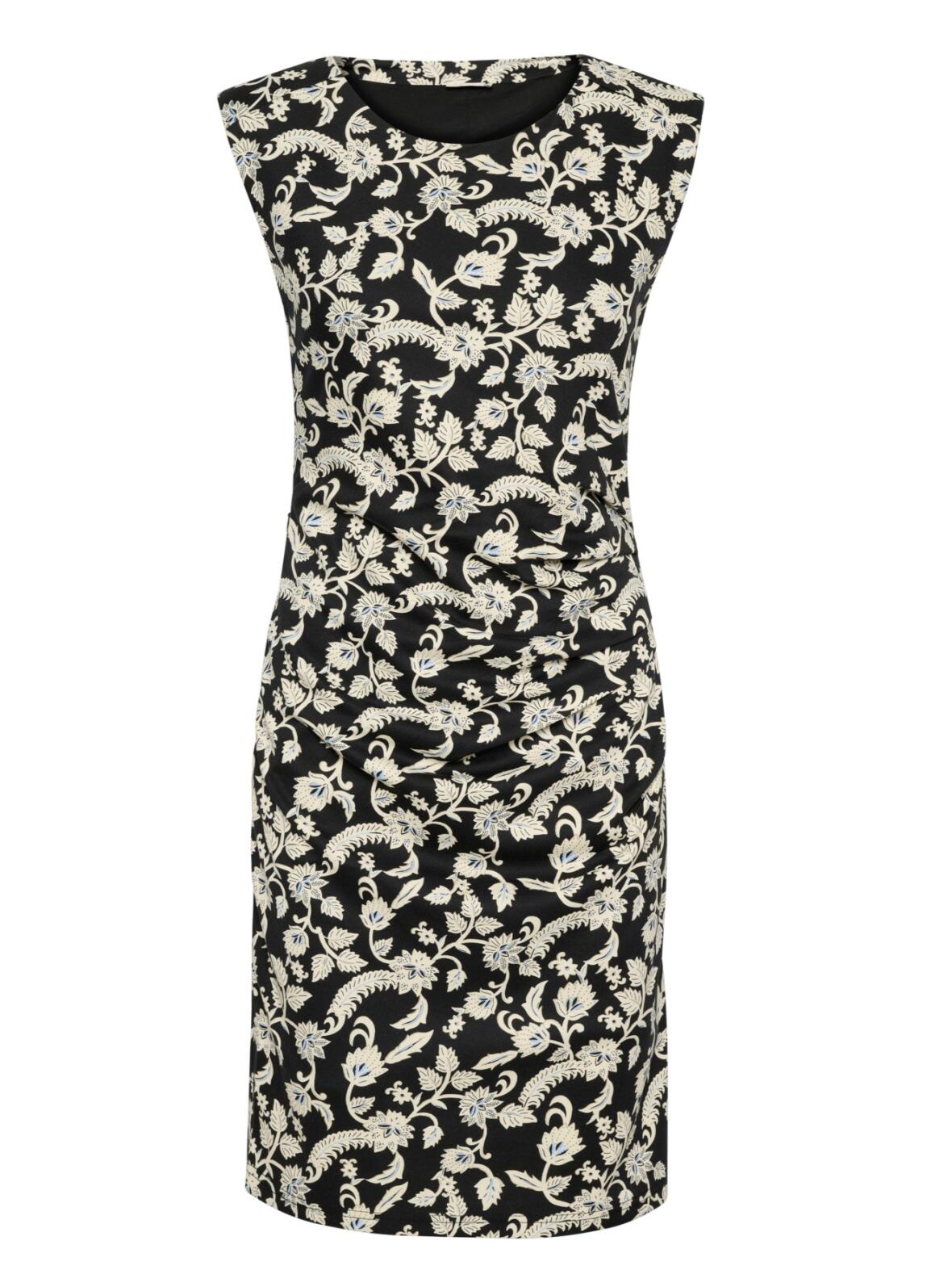 Kaffe India kjole med rund hals og uden ærmer. Kjolen har lynlås i højre side og drapering hen over maven. Meget velsdiddene og faconsyet kjole. Kjolen har længde til ca. til knæene. Kjolen er i elastisk jersey kvalitet og foret med sort polyester foer. Smuks blomster print i offwhite og lyseblå på sort bund. 74 % viscose, 22 % viscose og 4 % elastan. Vask ved 30 grader. Maks krymp 3-5 %.