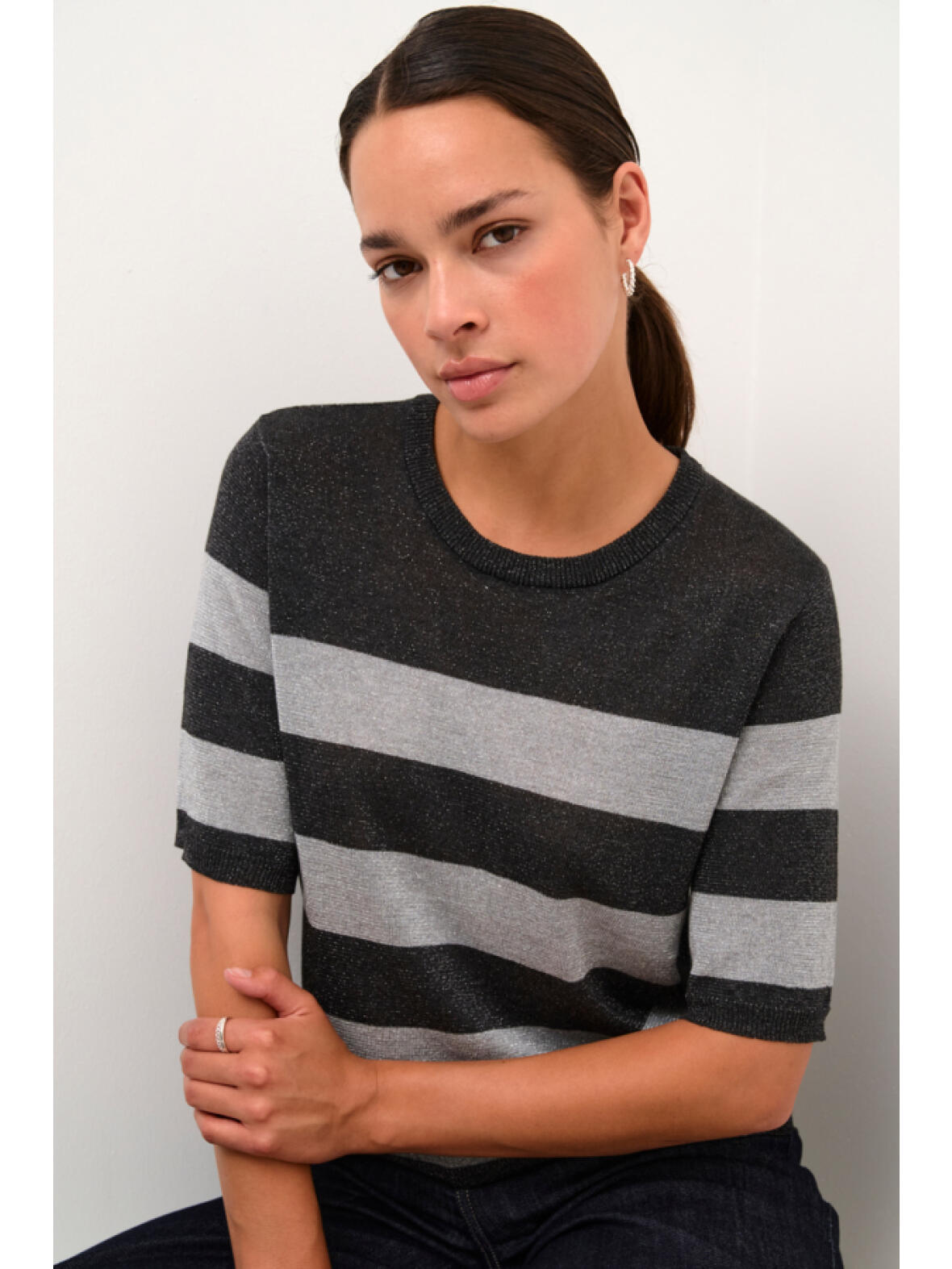 Kaffe Ankra kort ærmet strik bluse med brede vandrette striber i lys grå og mørk grå med glimmer tråde. Blusen har rund hals og ribkant forneden. Tynd strik som er semi transperent. 38 % ajryl, 38 % viscose, 16 % poklyester og 8 % metallisk garn. Vask ved 30 grader.