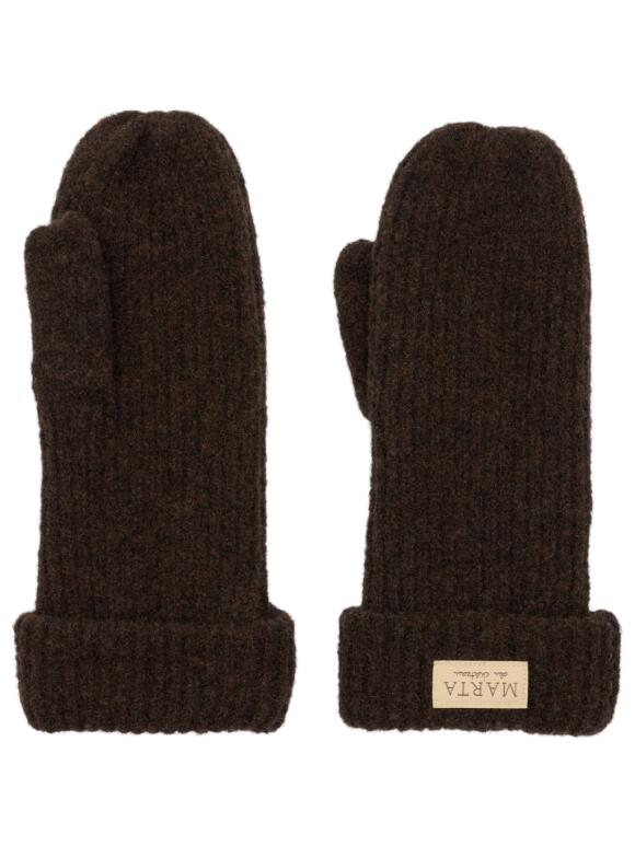 Marta Du Chateau Marta strik luffer. Mørk brun melange strik udvandigt og lun fleece foer indvendigt. 50 % genanvendeligt polyester, 24 % polyakryl, 16 % polyamid, 8 % uld og 2 % elastan. Vask ved 30 grader.
