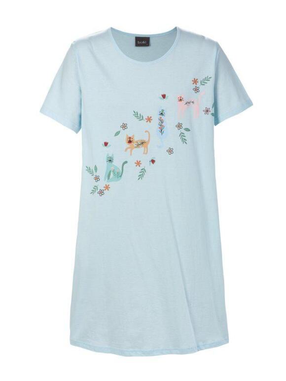 Trofé t-shirt natkjole med rund hals og kort ærme. Natkjolen har cirka knælængde. Lyseblå melange med motiv af katte på brystet. 100 % bomuld. Vask ved 60 grader.