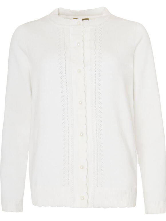 Offwhite Ofelia Tulle strik cardigan med rund hals og lange ærmer. Cardiganen er lukket med perlemorsknapper, er glat strikket og har fine borter med hulmønster ned langs begge sider af knapperne foran. Der er fin tungekant i halsen, forneden og i ærmerne. 52 % viscose, 28 % polyester, 20 % nylon. Vask ved 30 grader.