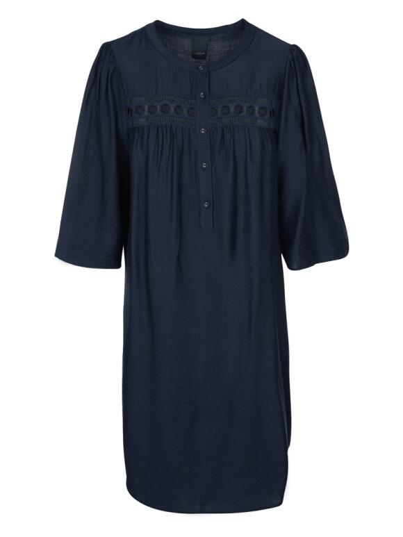 One Two Luxzuz Carolat marine blå kjole. Kjolen har rund hals med stolpelukning og knapper foran, Korte vidde ærmer med puf på skulderen. Hen over brystet er der en fin hulmønstret bort. Kjolen har regulær facon og trekvart længde. Slids i begge sider forneden. 87 % viscose og 13 % polyester. Vask ved 30 grader.