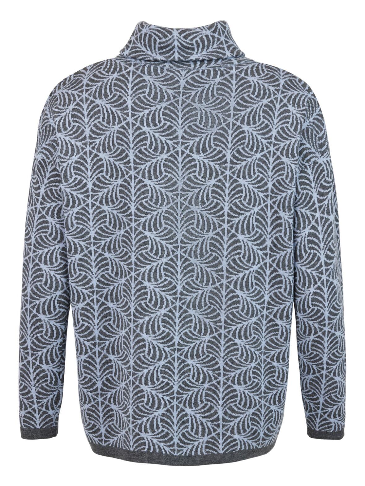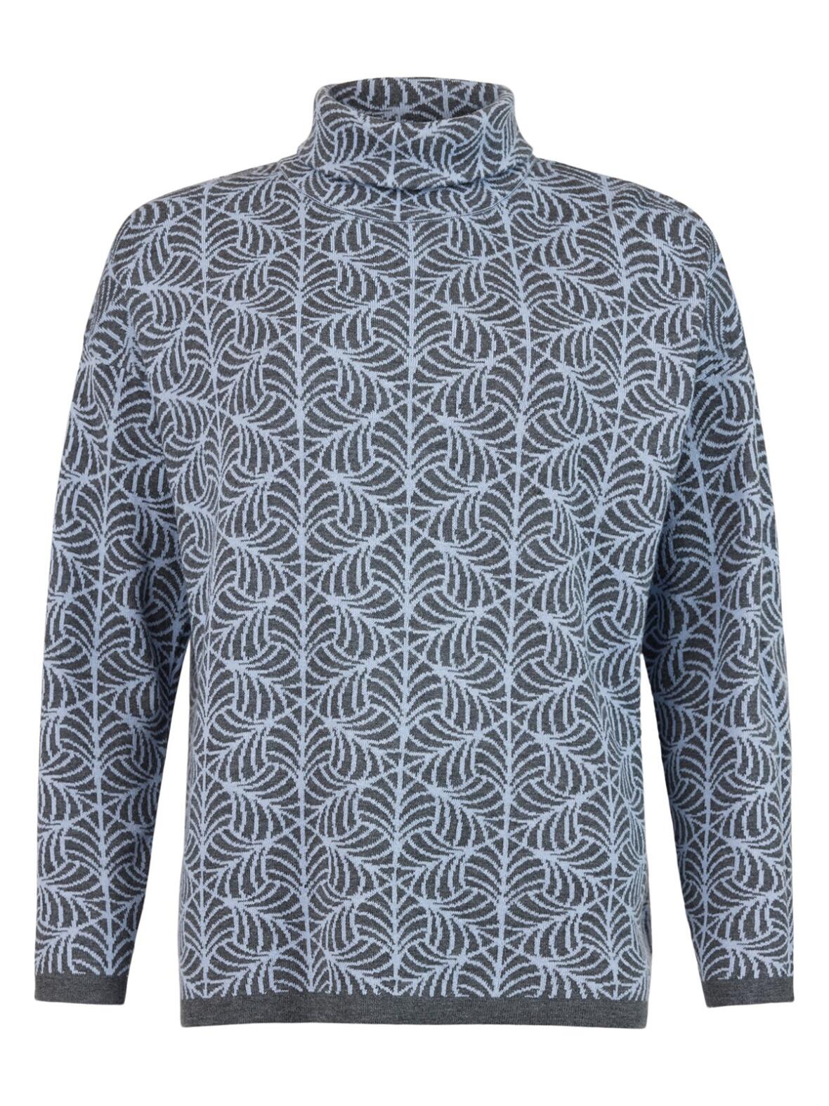 Sunday rullekrave strik med løs rullekrave og lavt påsat lange ærmer. Glatstrikket med med bladlignende mønster i lyseblå på koks grå bund. Smal koks grå kant forneden og nederst i ærmerne. 55 % akryl og 45 % bomuld. Vask ved 30 grader.
