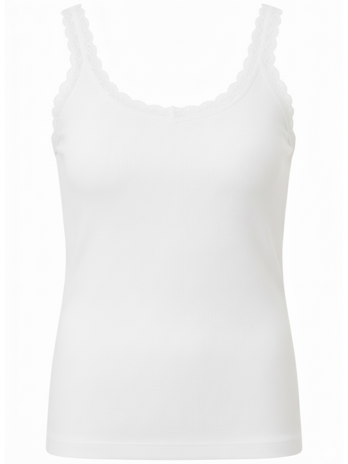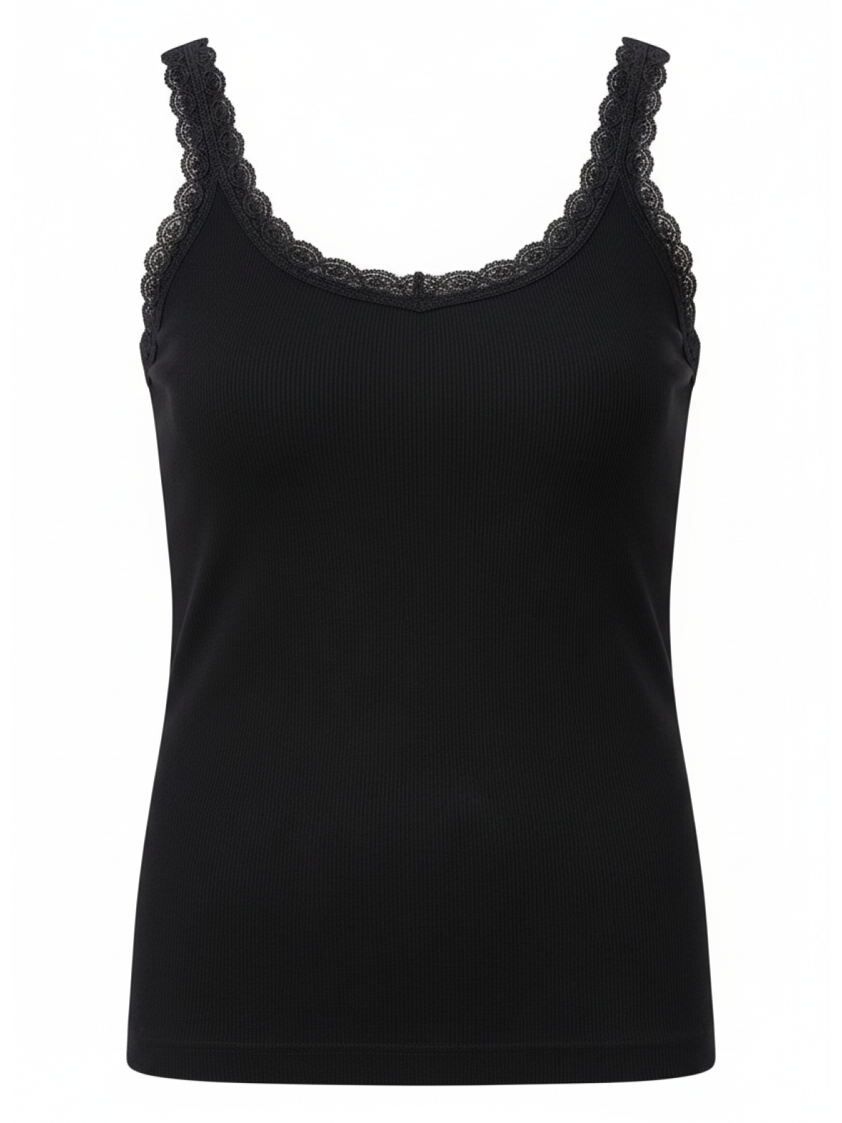 Vanting lækker microfiber rib top med flot blonde kanter. Fåes i hvid og sort. 92 % polyamide og 8 % elastan. Vask ved 40 grader.