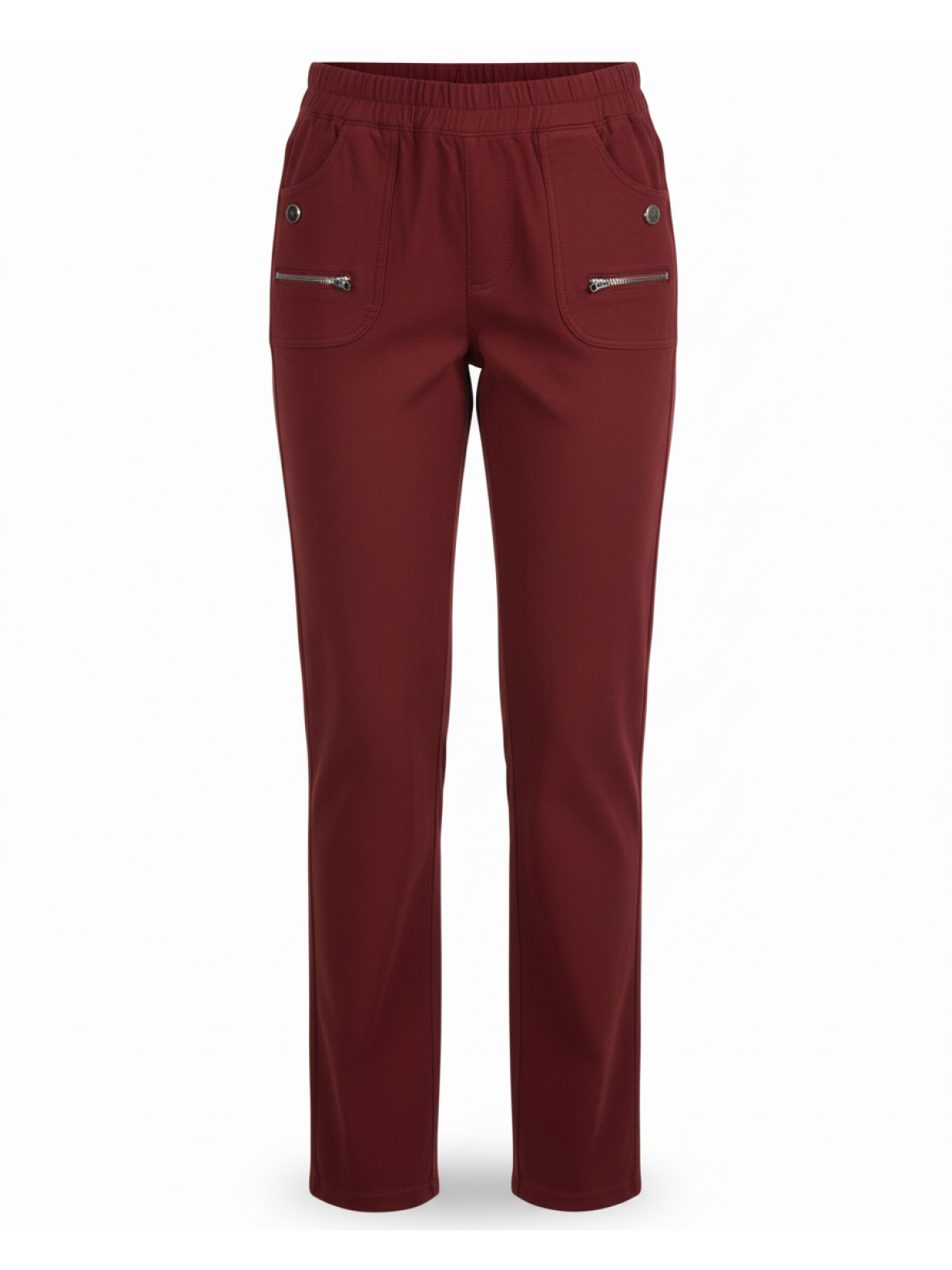 Vinrød Vanting bingo bukser med polar foer på bagsiden. Buksen har elastik i taljen på nær lige midt foran, hvor linning er flad. Påsatte lommer med lidt lynlås pynt foran og moderat ben vidde. 77 % viscose, 19 % polyamid og 4 % elastan. Vask ved 30 grader.