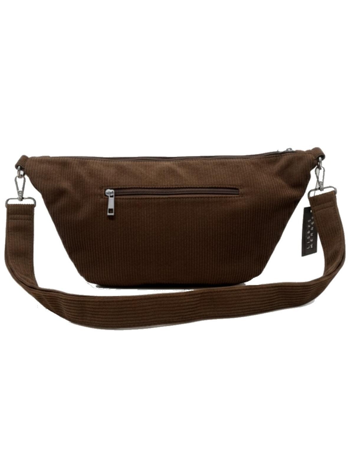 Lisbeth Merrild crossover bumbag i brun bredriflet fløjl. Vi elsker fløjl, og er glade for, at det vender tilbage generelt i modebilledet. På tasken giver det en spændende effekt med fløjlsmønsteret, som også er behageligt at røre ved og have ind til kroppen.