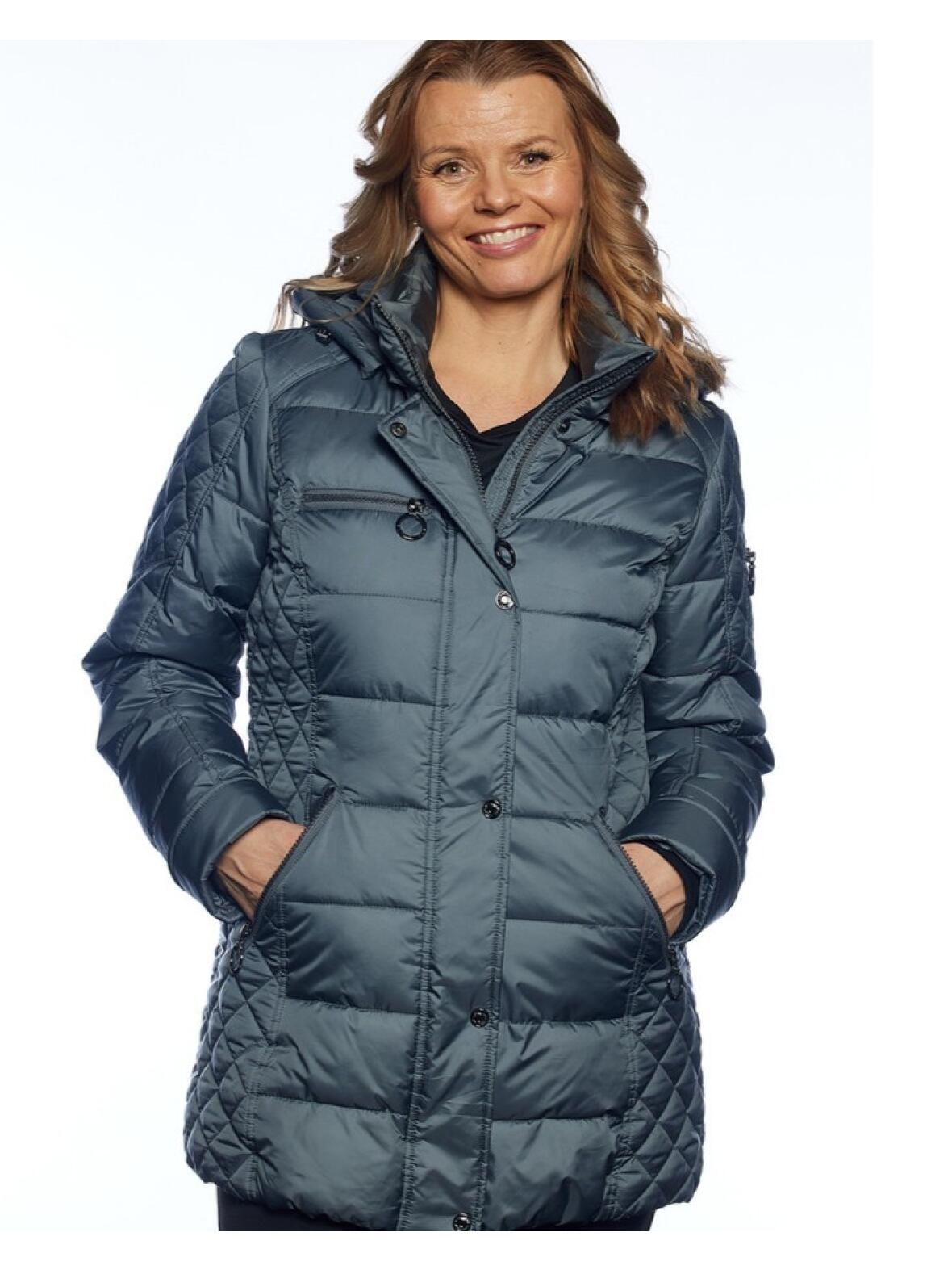 Jolina dynejakke fra Windfield er en god investering til vintervejret. Den kommer i en grå farve og quiltede syninger, der gør den spændende at se på. Du bliver glad for den praktiske hætte, høj krave, lommer foran med lynlås og bevægeligheden når du går og cykler.