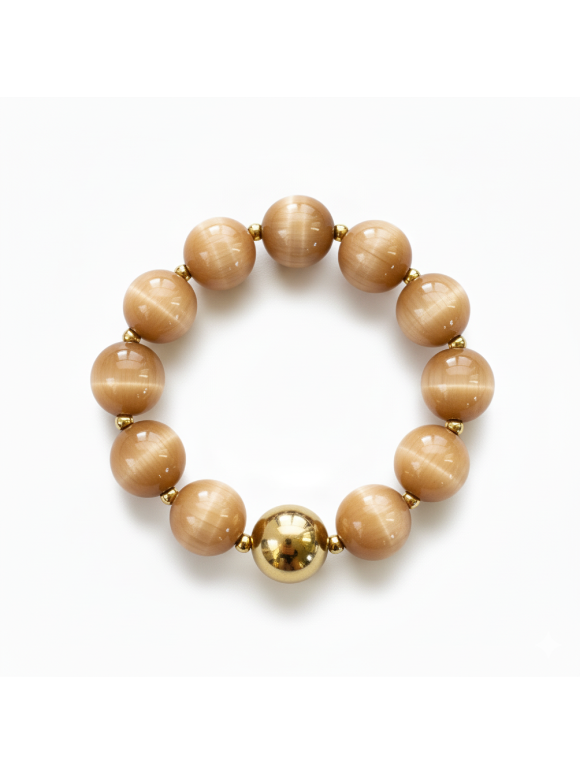 Eksklusivt armbånd med store kugler (ca. 1,5 cm) i smukke sandfarvede nuancer med lysere årer, der giver et naturligt og levende spil. De små guldfarvede perler og den store gyldne midt kugle tilføjer elegance og luksus til designet.