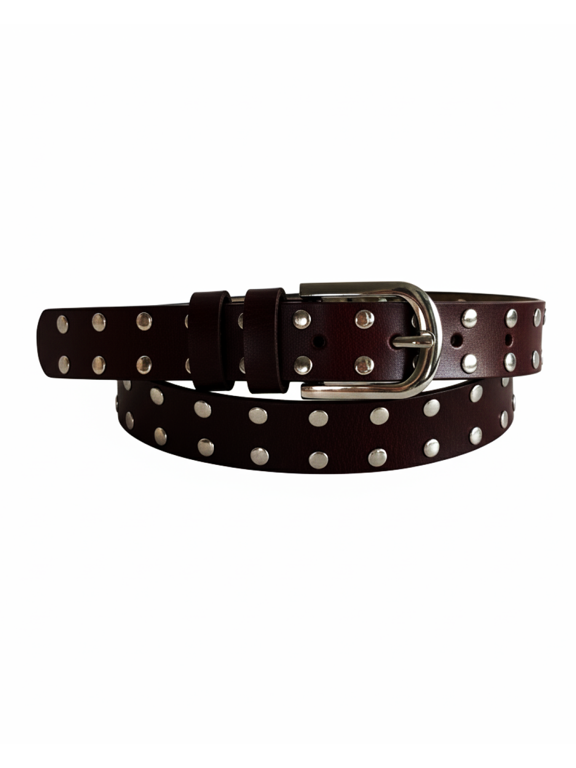 Three M mørkebrunt læderbælte med sølvfarvet spænde, som vil se godt ud til både bukser og jeans. Bæltet har sølvfarvede nitter i to rækker hele vejen rundt, og de gør hele forskellen for bæltet. Et flot og råt look, som ikke kræver en bestemt anledning.