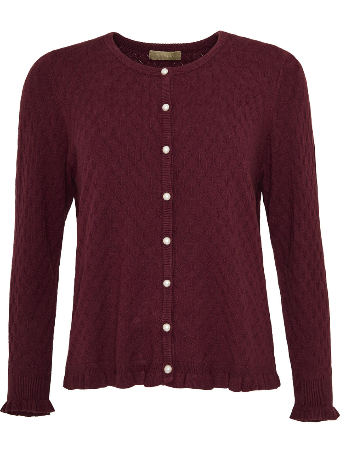Ofelia Aja bordeaux cardigan med et fint hulmønster som skal opleves. Foran er der påsyet de fineste perler i perlemor look, som får strikken til at se ret eksklusiv ud.
