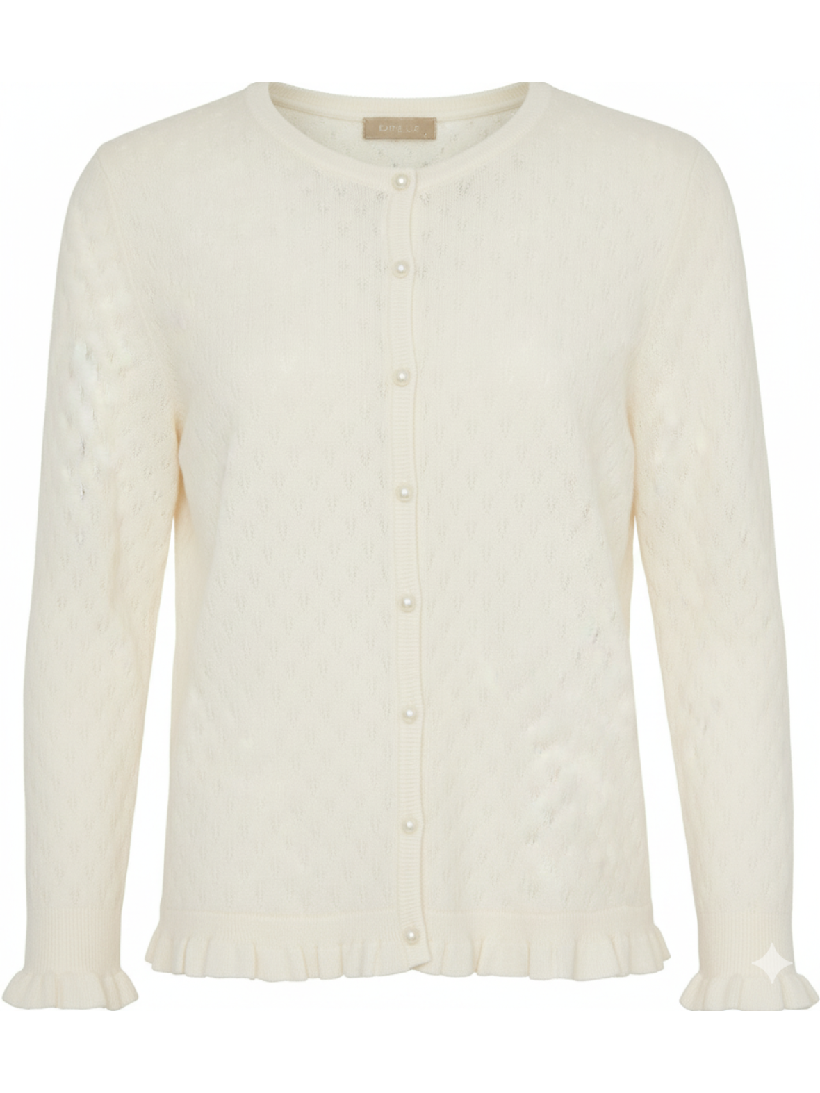 Ofelia Aja offwhite cardigan er en spændende tilføjelse til din garderobe. Den har lange ærmer med flæser, som går igen forneden. Men det helt særlige ved Aja strikken er det hulmønster, der går igen over alt og knapperne i perlemor. Fine detaljer, der gør, at den skiller sig ud fra andre basic strik styles.