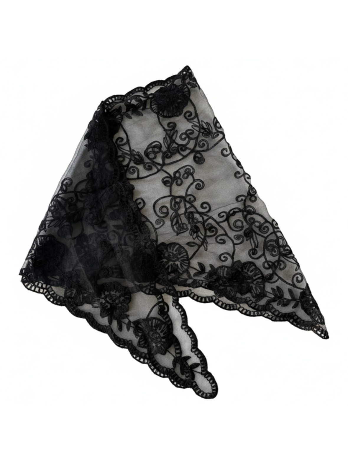 Et smukt og tidløst tørklæde i sort blonde, der kombinerer femininitet og elegance. Det fine transparente materiale med detaljerede blomster- og bladmønstre giver et sofistikeret udtryk, perfekt til både hverdag og festlige lejligheder.