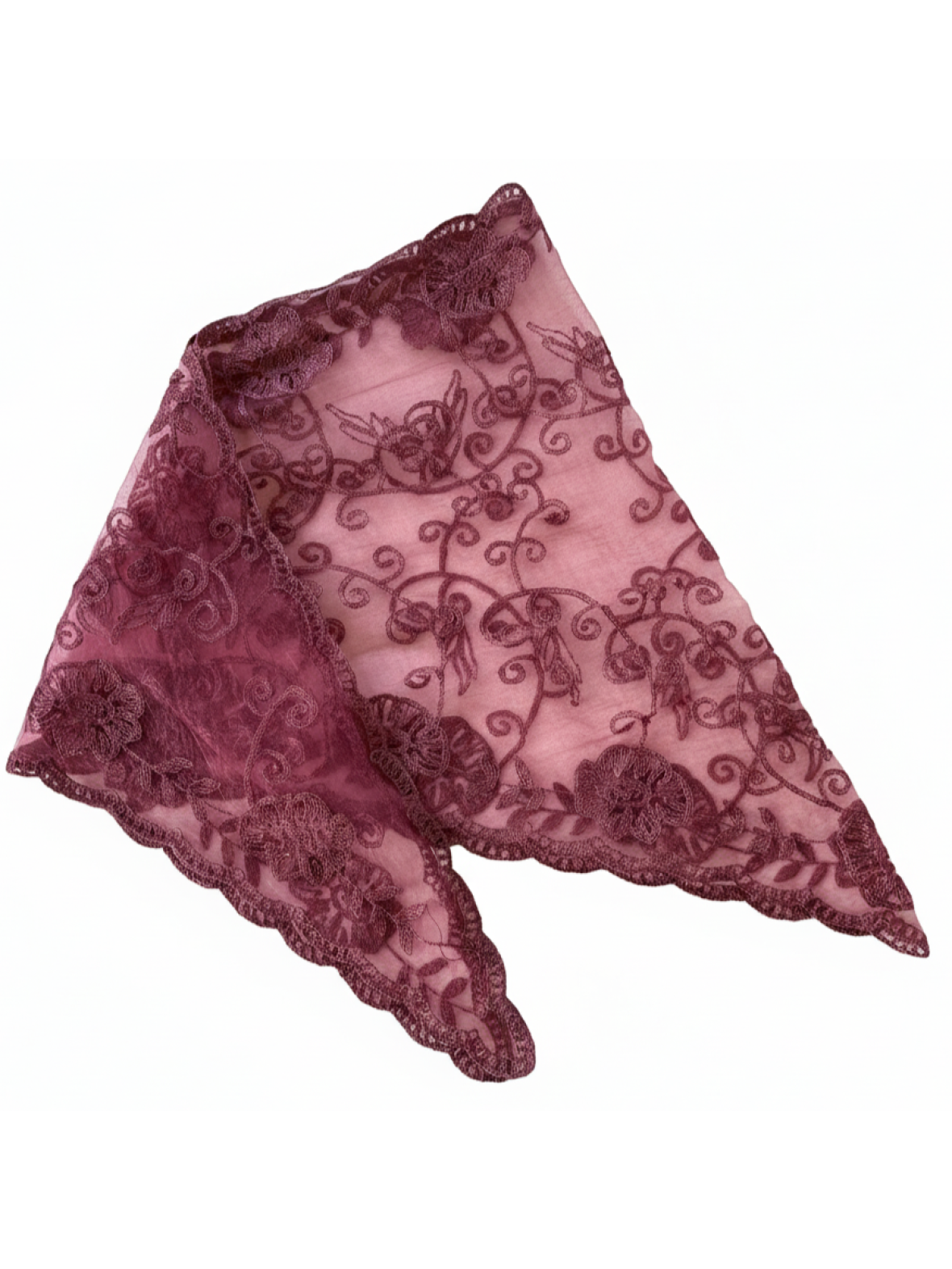 Et smukt og tidløst tørklæde i bordeaux blonde, der kombinerer femininitet og elegance. Det fine transparente materiale med detaljerede blomster- og bladmønstre giver et sofistikeret udtryk, perfekt til både hverdag og festlige lejligheder.