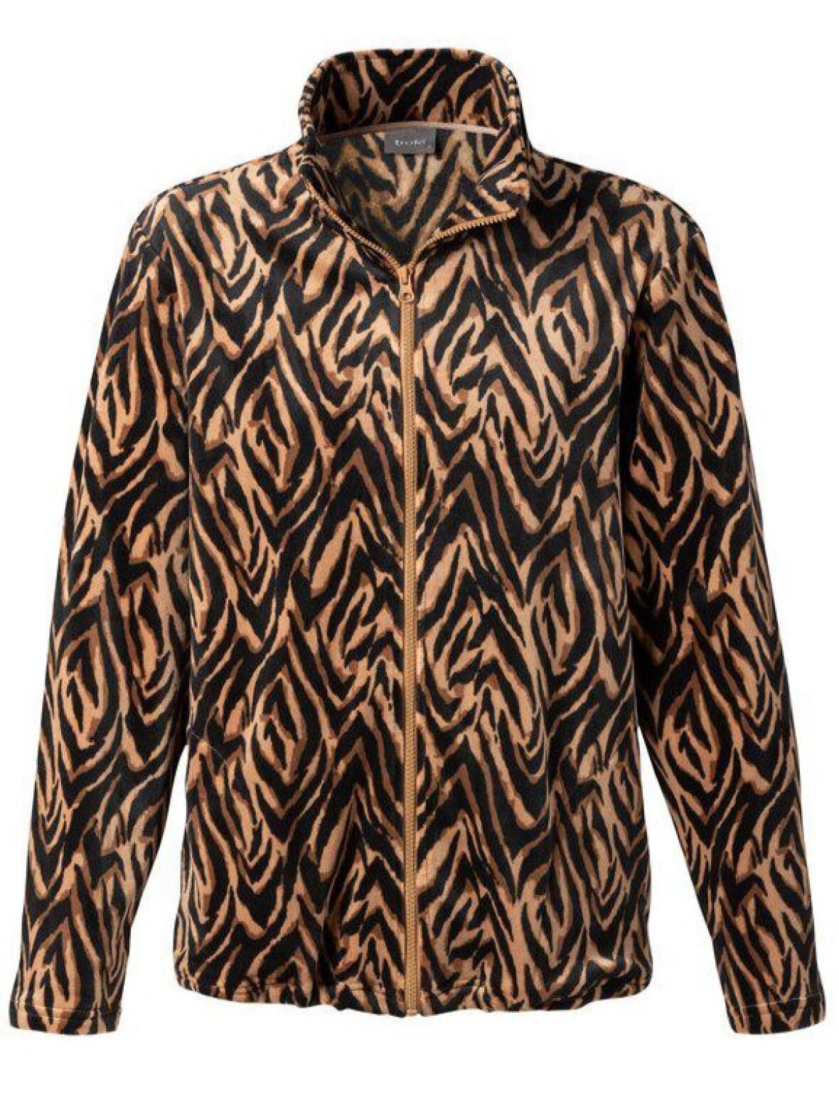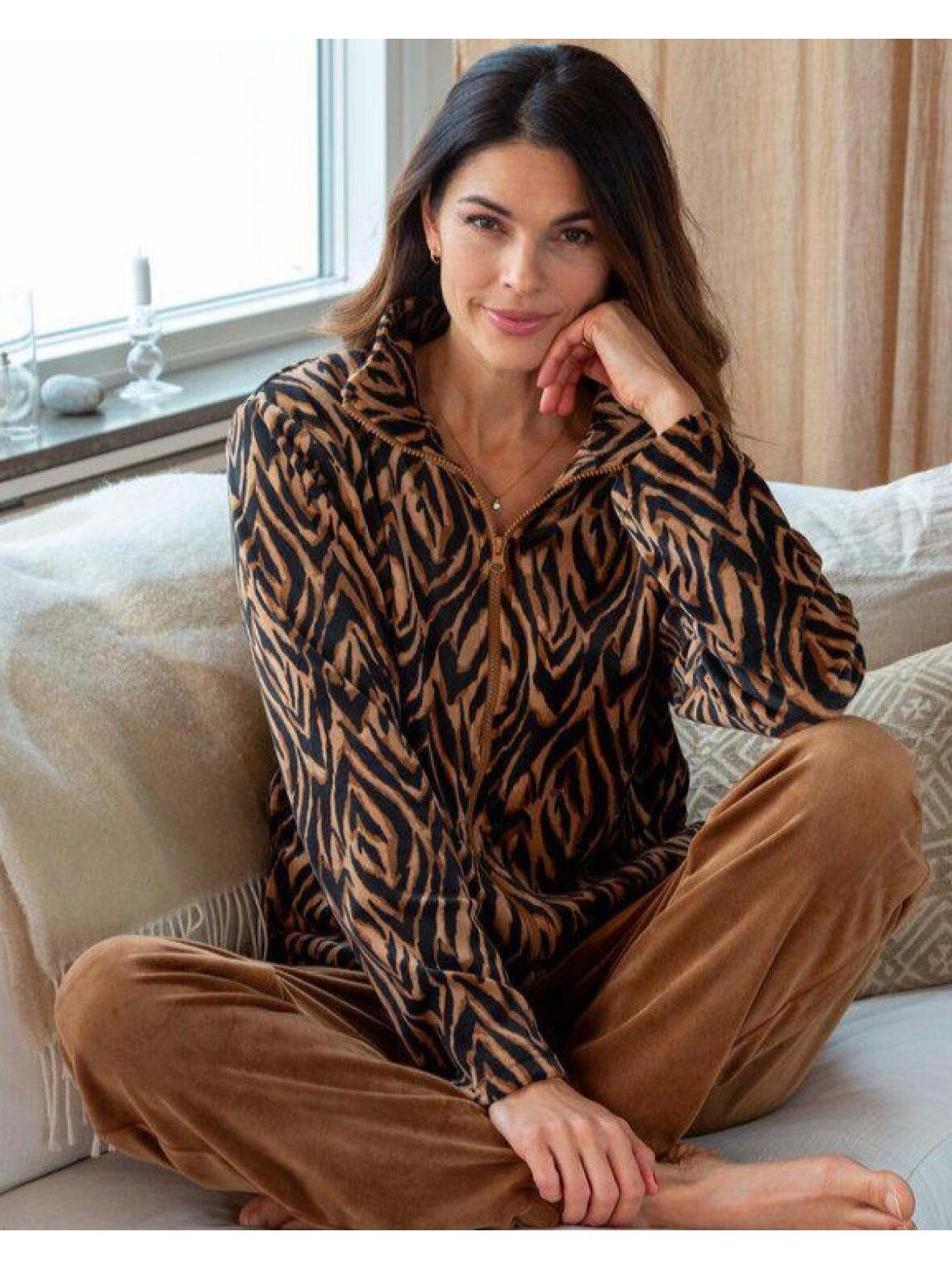 - Jakke med lynlås og sidelommer i tiger striber i lys brun og sort.