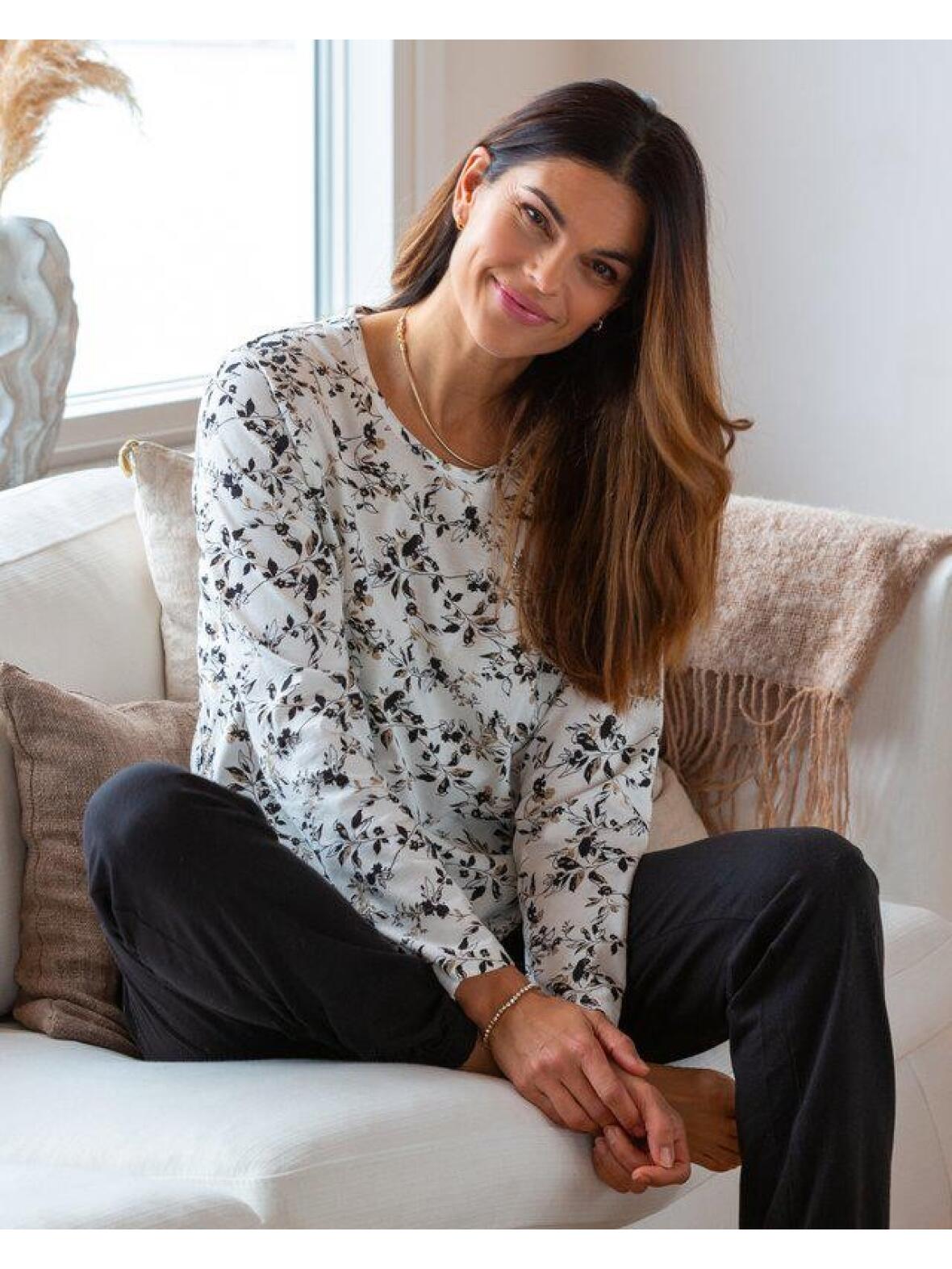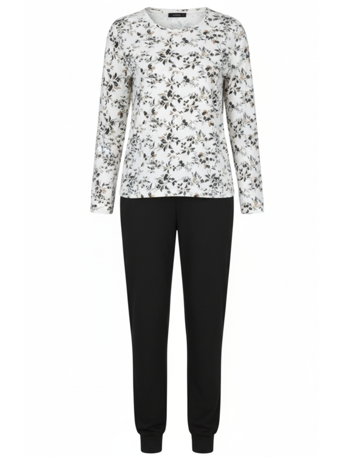 Pyjamas fra Trofè, den perfekte tilføjelse til din aftenrutine. Denne stilfulde pyjamas kombinerer en hvid blomstret top med sorte bukser, hvilket giver et elegant og afslappet look. Den er lavet af 100 % bomuld, hvilket sikrer, at du får en blød og behagelig oplevelse hele natten.