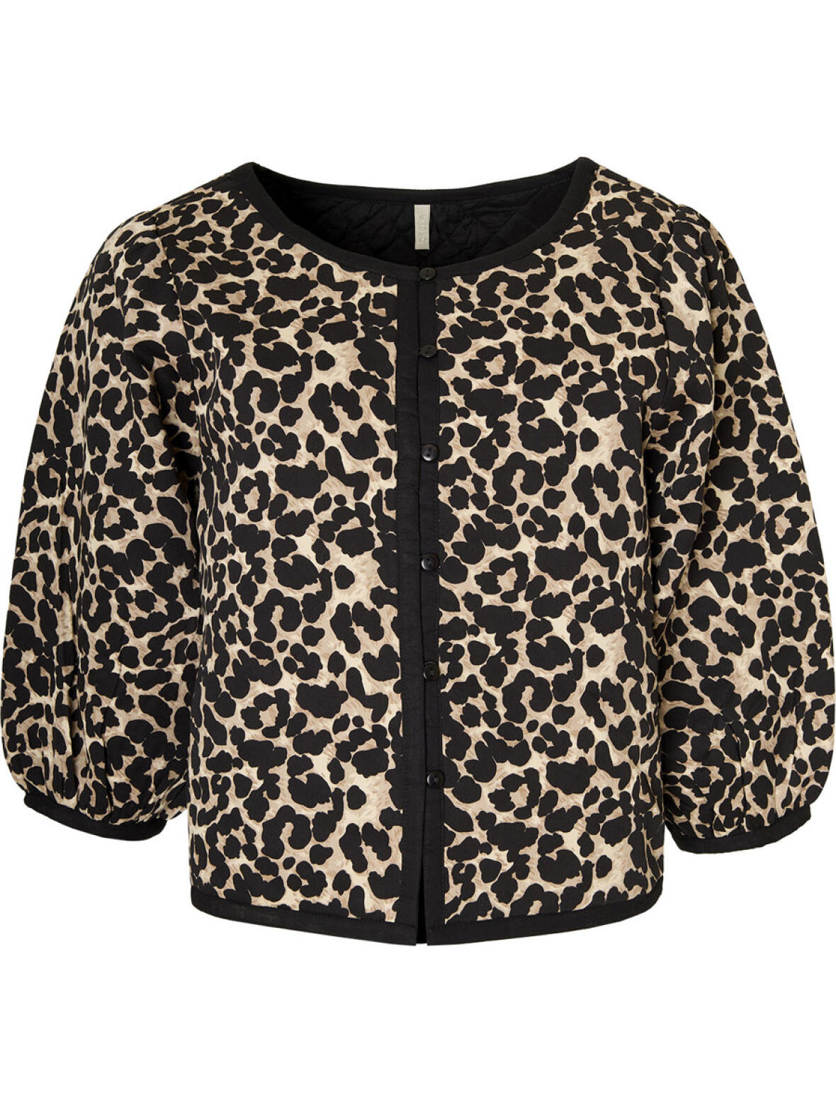 Denne smarte Ofelia Sally jakke kombinerer komfort og stil med sit flotte leopardprint og let vatterede materiale. Jakken har en rund halsudskæring, trense knaplukning foran og 3/4-lange pufærmer, der giver et feminint touch. Perfekt som overgangsjakke eller som et trendy lag over dit outfit.