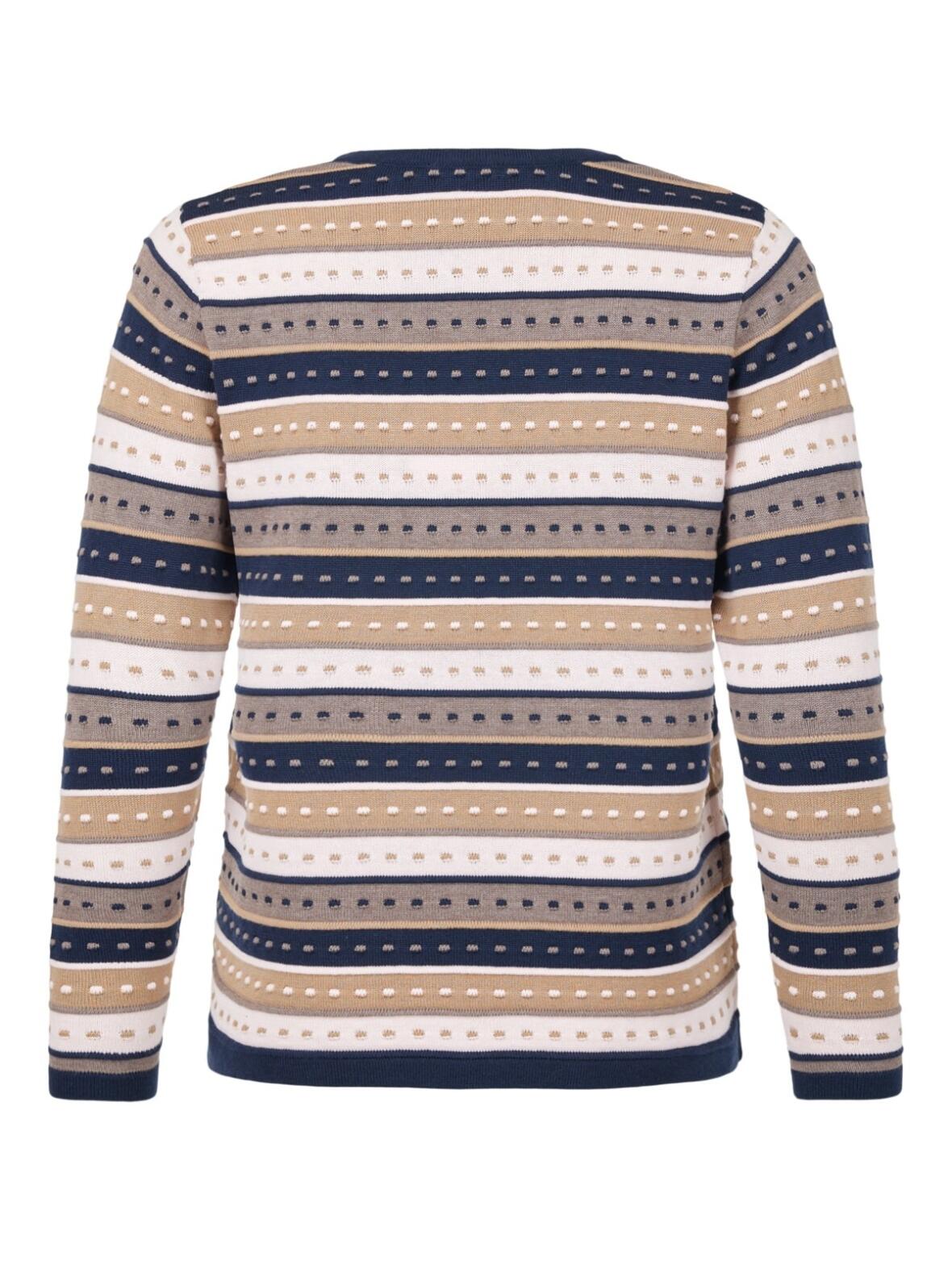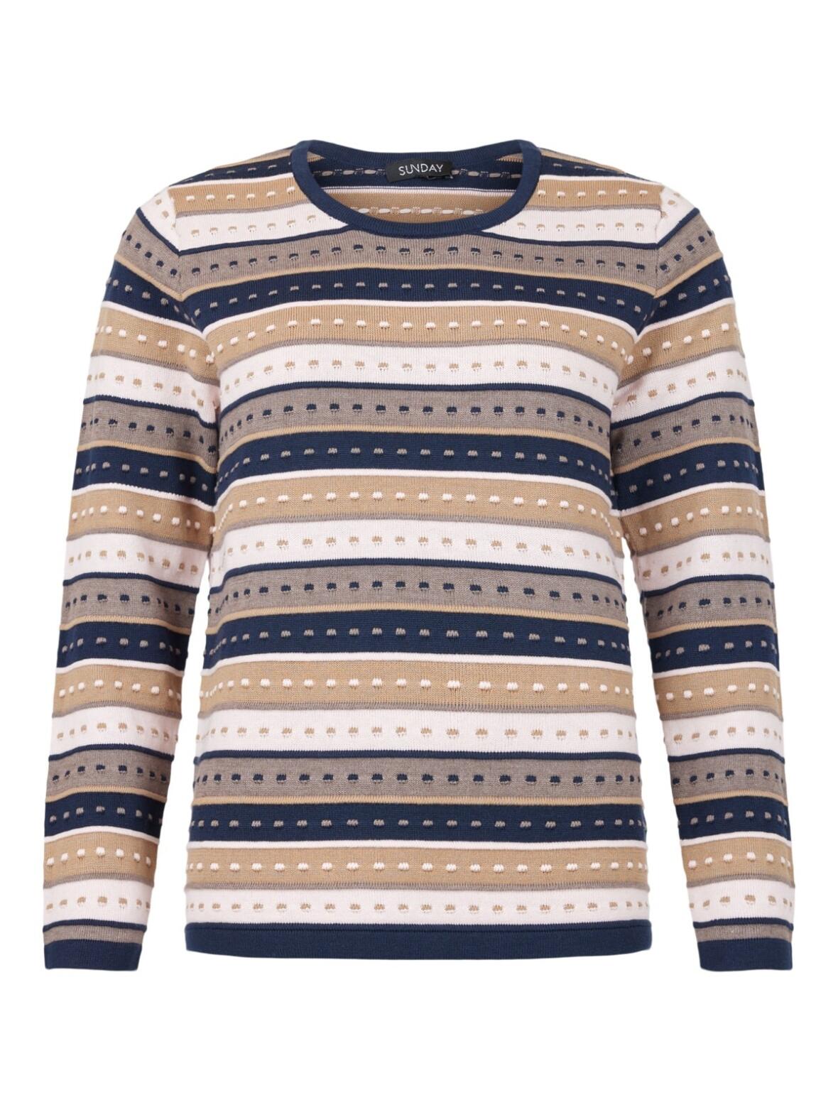 Pulloveren har et flot vandret stribemønster i en alsidig farvekombination af marineblå, sart rosa, hvid og diskrete grå nuancer. Hver stribe er udsmykket med et nydeligt, prikket strukturmønster, der giver trøjen liv og dybde. Den har en klassisk rund hals med ribkant i marineblå.