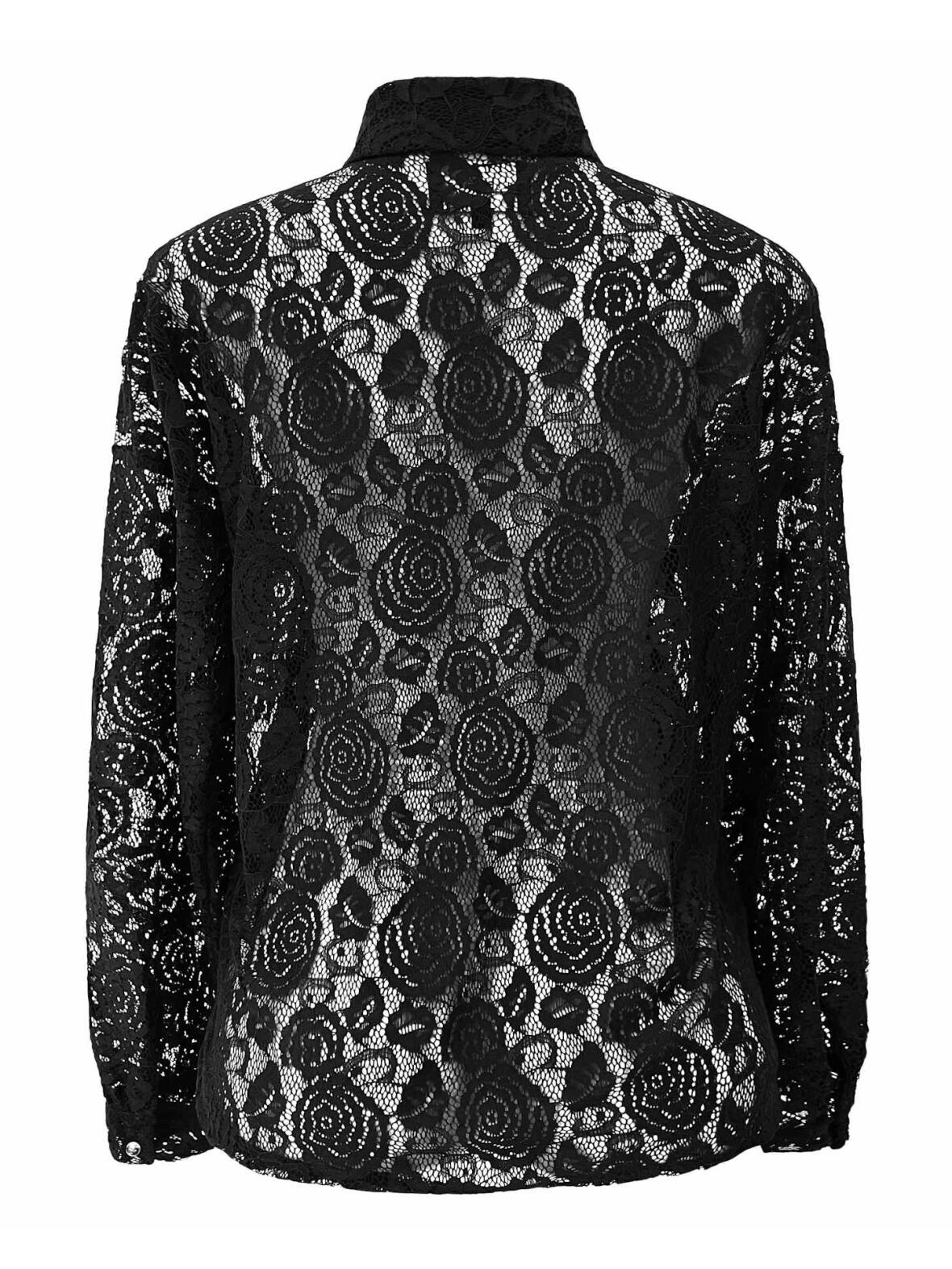 Denne lacy22270 sort blonde skjorte bluse har lange ærmer og en skjult knappelukning foran, lavet i blød og let stretchet kvalitet (92% polyamid, 8% spandex). Pasformen er tættere ved kroppen uden at stramme, hvilket giver en smigrende silhuet og en afdæmpet, romantisk stemning, perfekt til både arbejde og afslappede aftener.