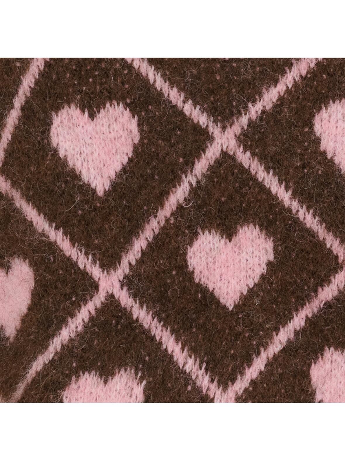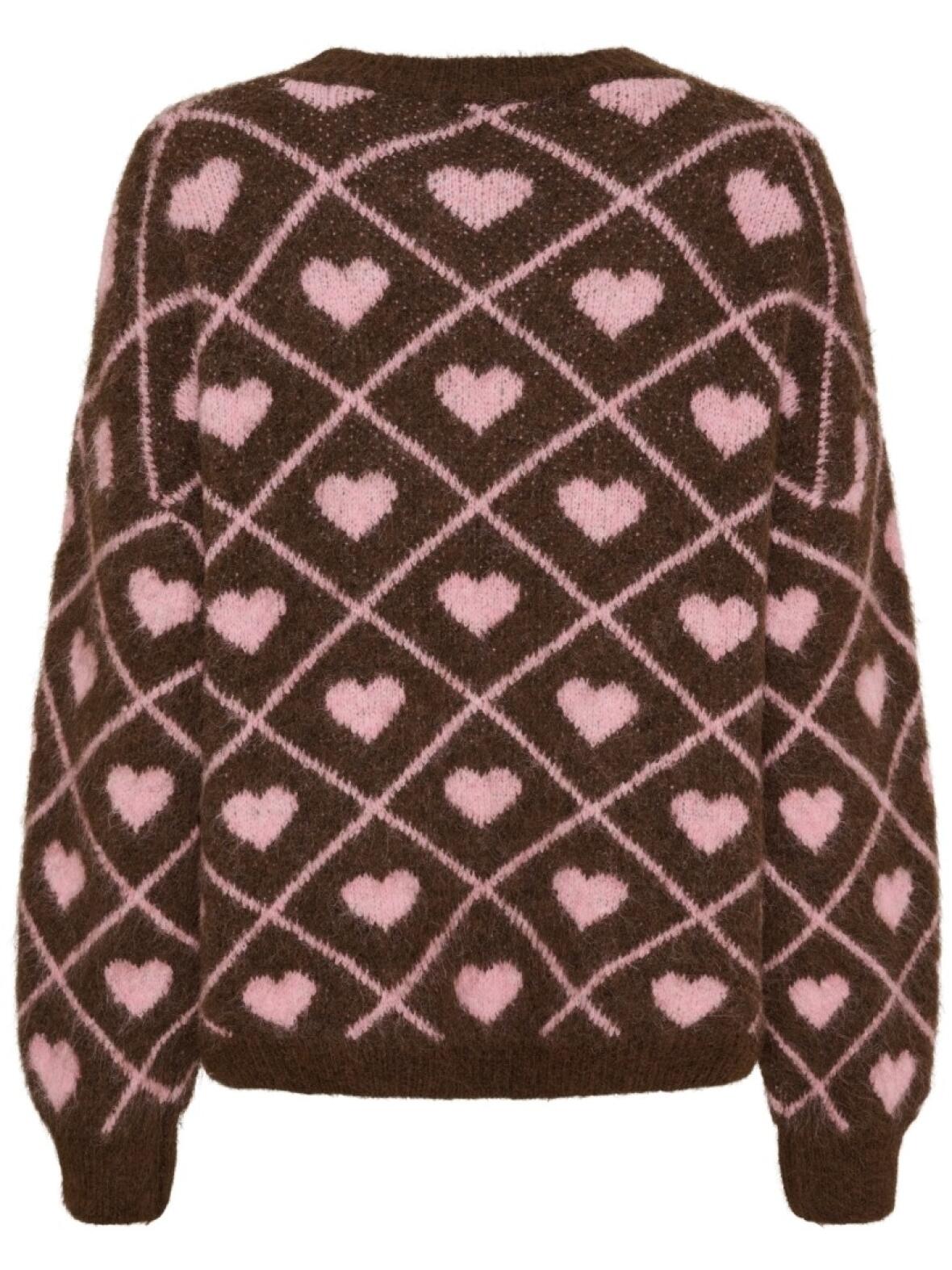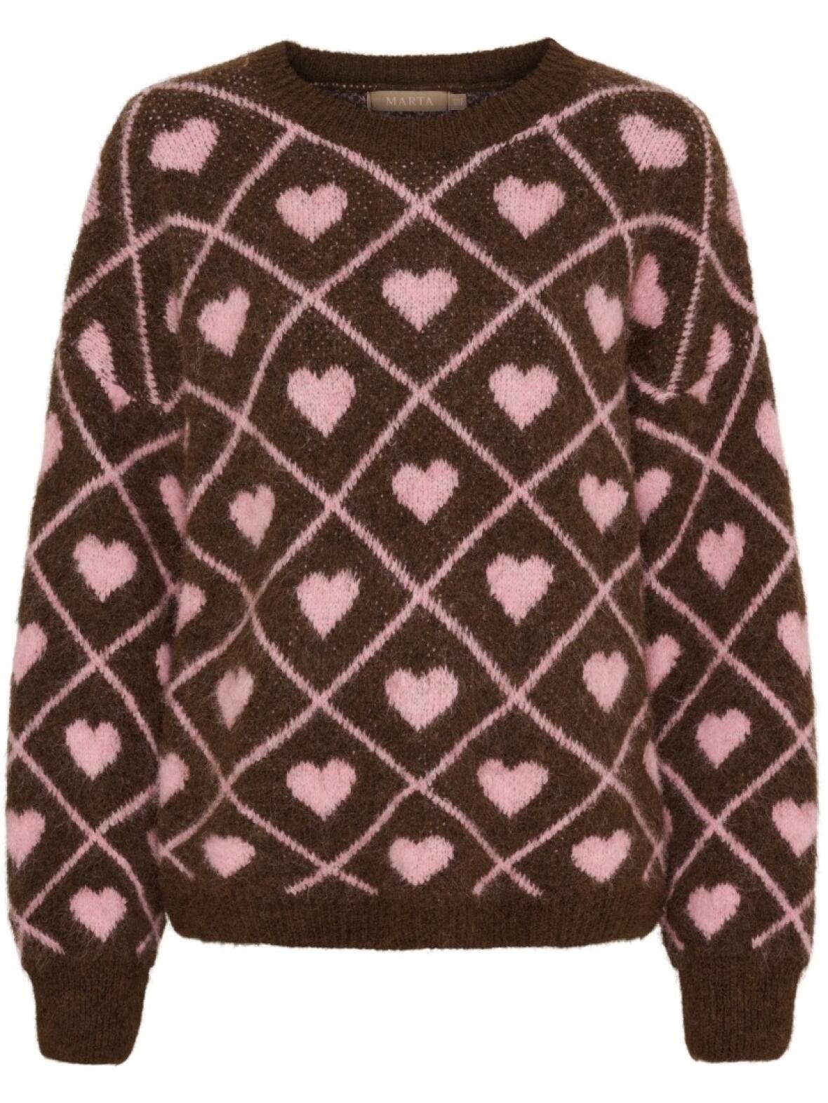 Marta Du Chateau Feray strik pullover i brun med lyserøde hjerter præsenterer en sart kontrast mellem dyb brun og blidt rosa.