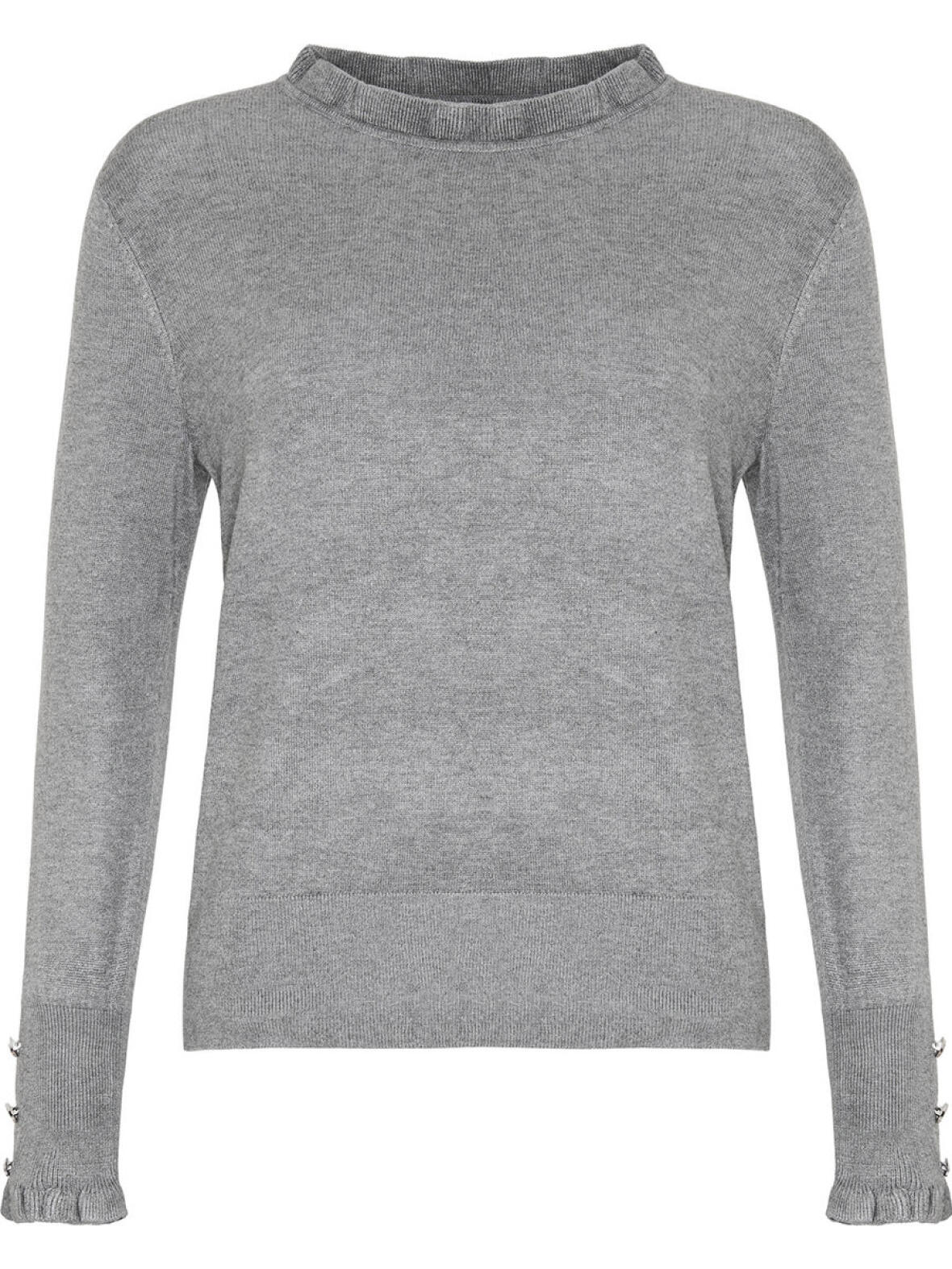 Fanny grå stik pullover fra Ofelia 70 % viscose og 30 % nylon. Materialet føles blødt mod huden og giver en let, behagelig varme uden at virke tung. Designet har fine ribkanter ved hals og bund samt diskrete knapdetaljer ved ærmekanten, hvilket skaber et feminint og roligt udtryk med god hverdagsstil. Vask ved 30 grader.