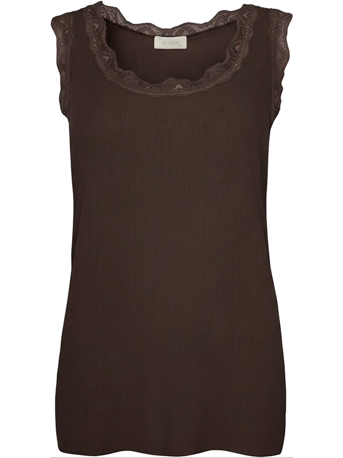 Toppen har en ribstrikket struktur med fine blondekanter ved hals og ærmegab, som tilfører en sart og sofistikeret stemning. Den bløde, lette kvalitet følger kroppens linjer uden at stramme og fungerer både som neutralt basislag og som fint element i en mere dresset sammensætning.