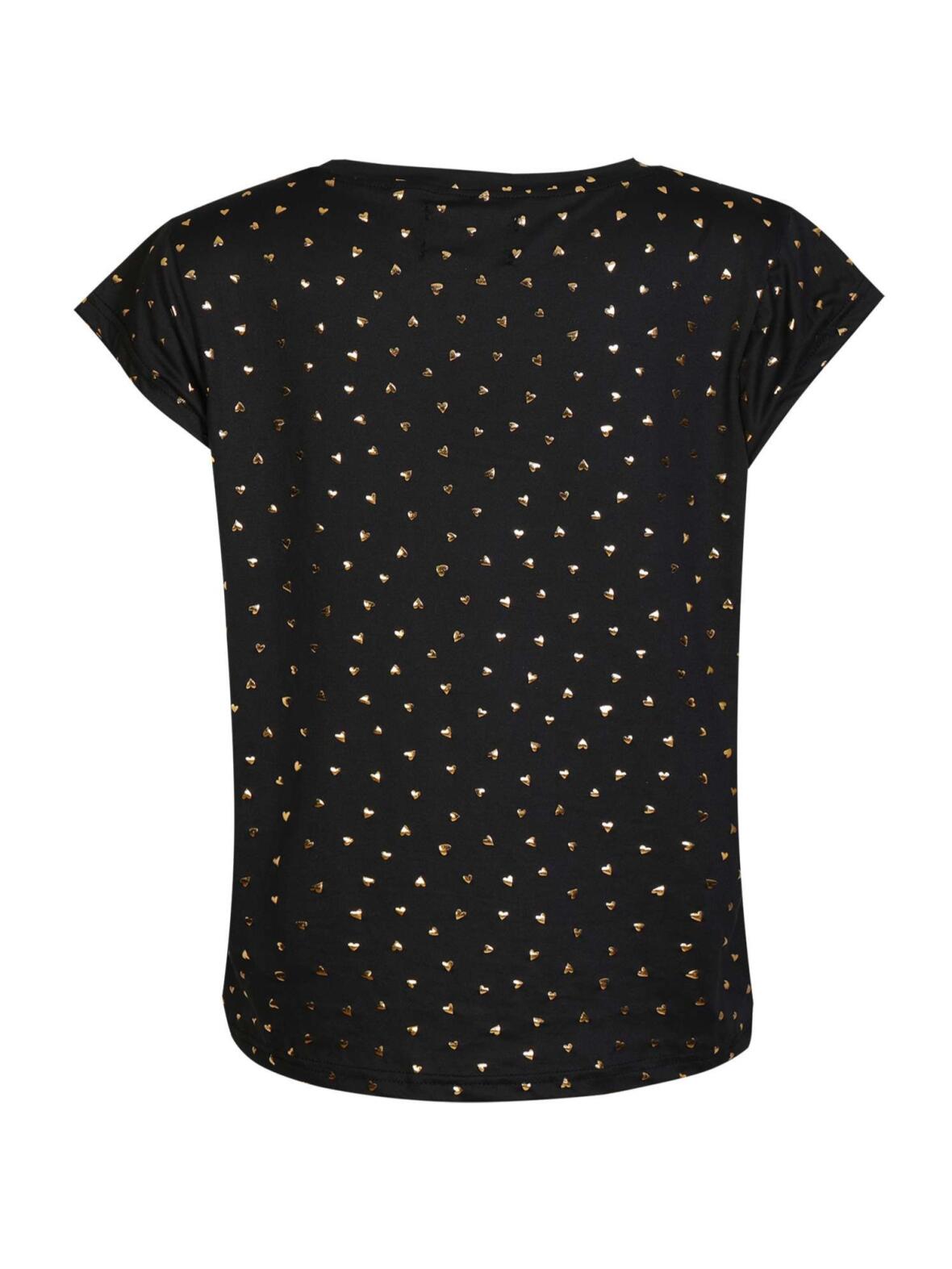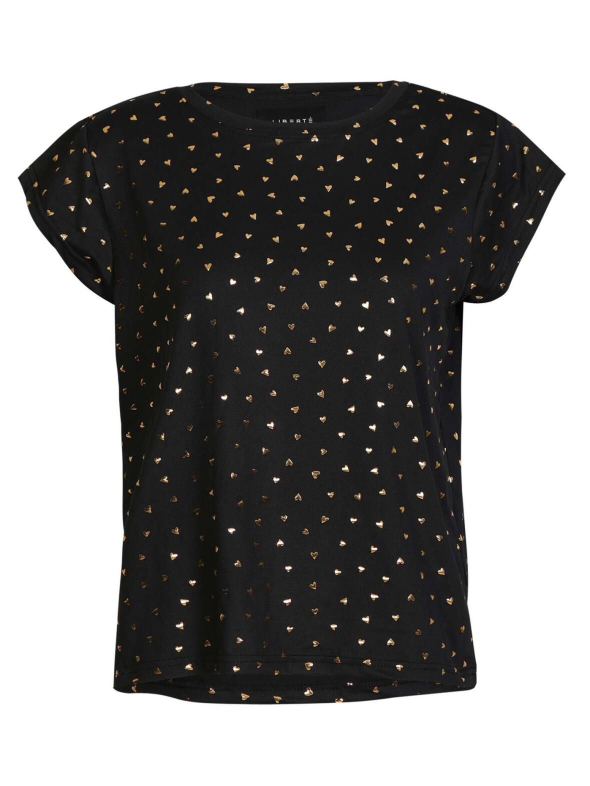 Libertè Alma-modellen har rund hals og korte vingeærmer. T-shirten har en sort base med trykte guldhjerter, let glans og en behagelig stretch, så den falder naturligt og komfortabelt. Stemningen er enkel og elegant, velegnet til både afslappede dage og mere dressed up lejligheder.