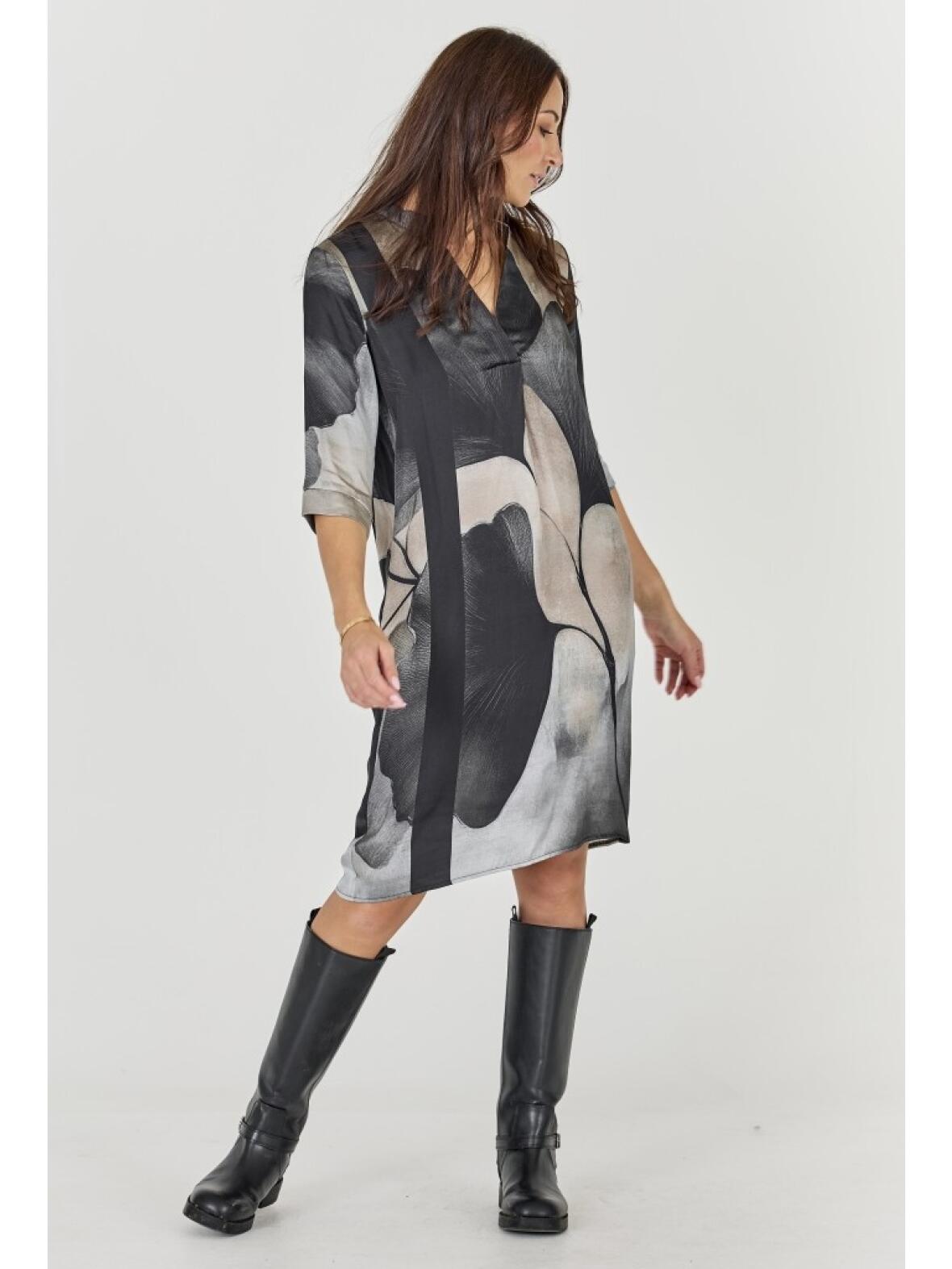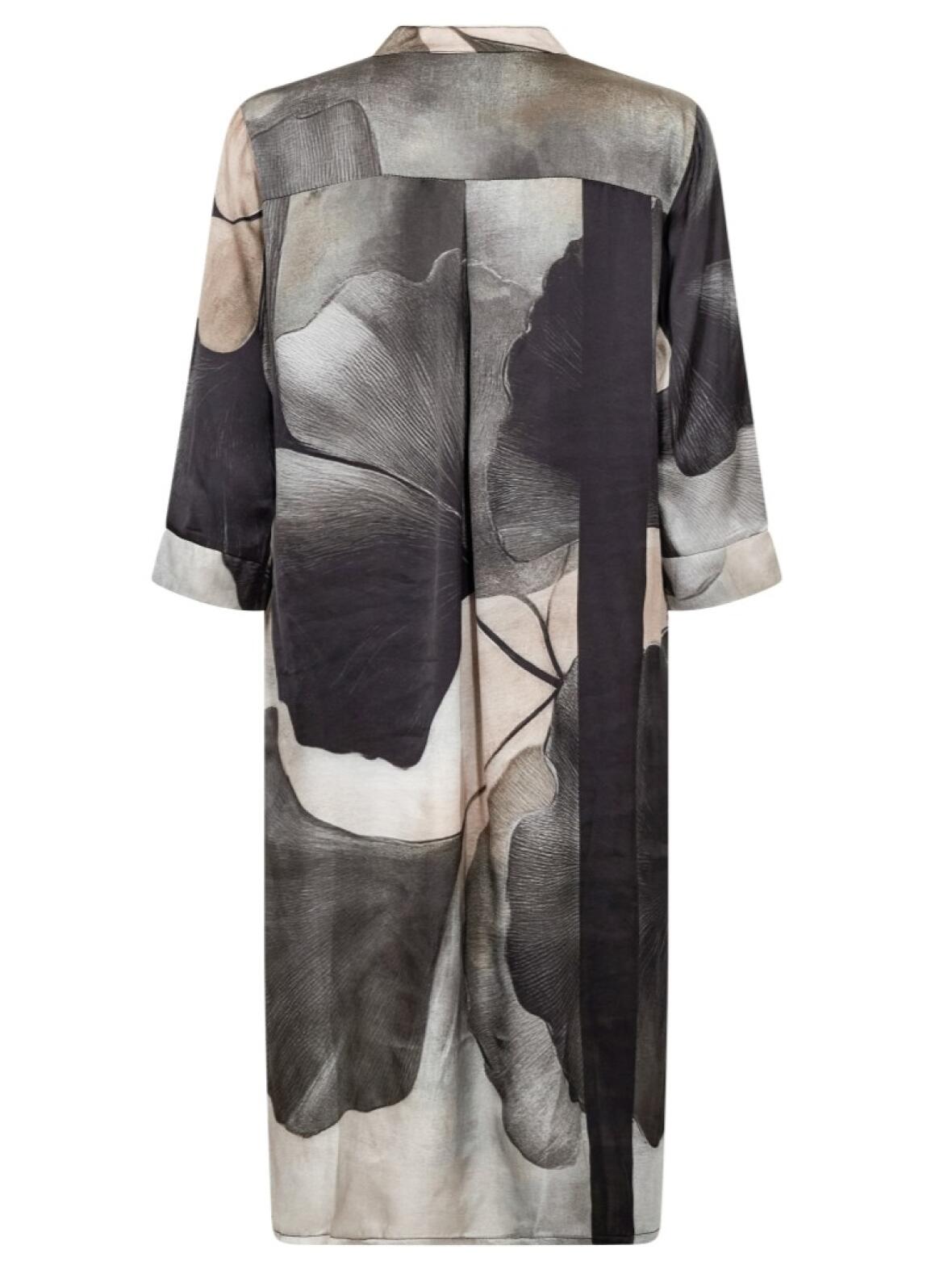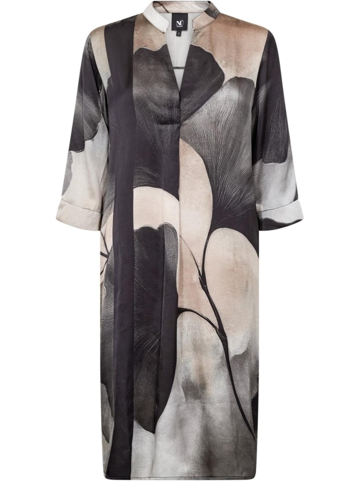 Kjolen er skåret i et løst, lige snit med 3/4-ærmer, stående krave og V-udskæring. Stoffet i 100 % viscose falder blødt og let, og det grafiske print tilfører et feminint, afdæmpet udtryk, der fungerer både til hverdagsbrug og ved mere festlige anledninger.