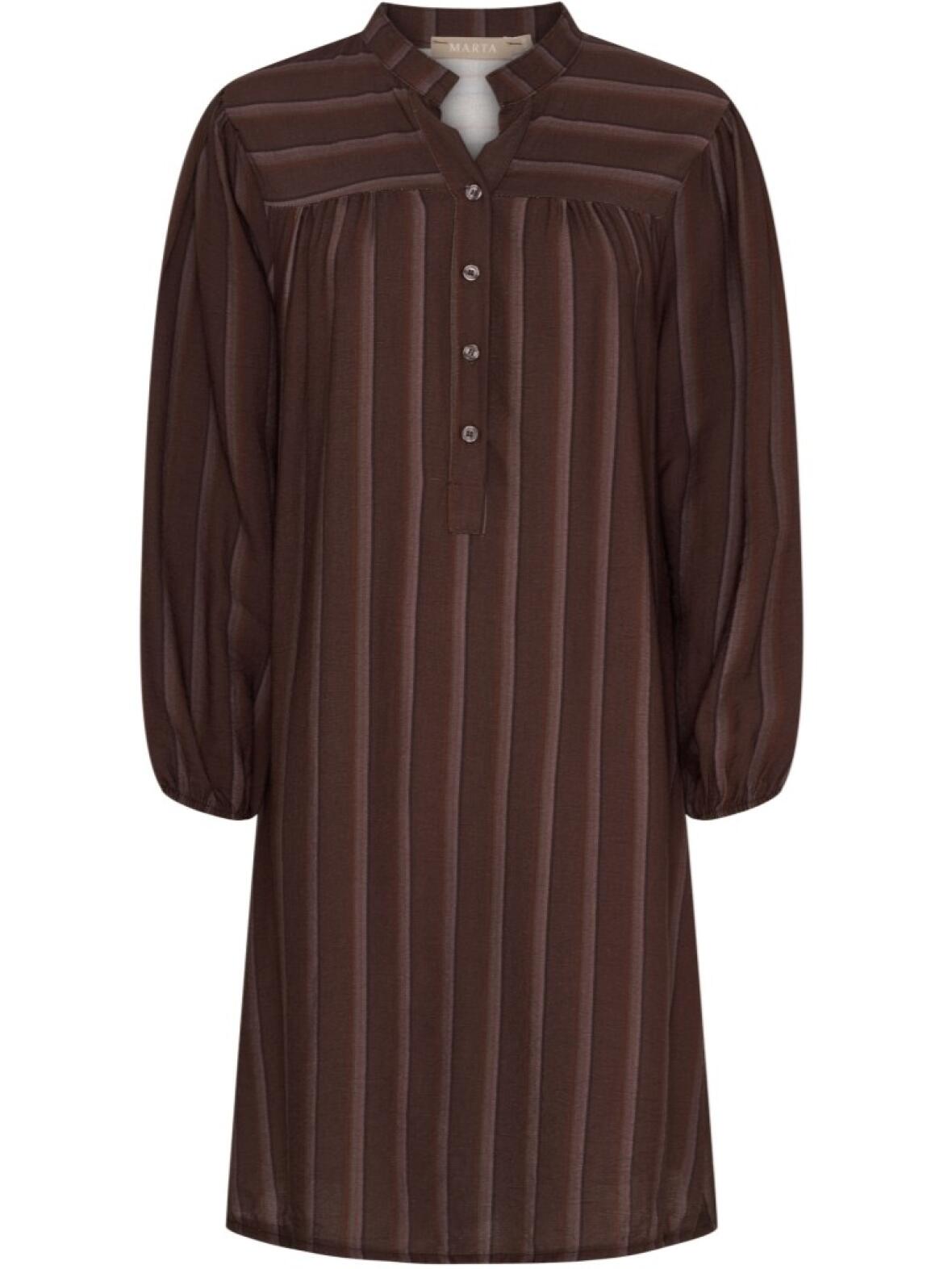 Lupin-tunikaen har et roligt, feminint udtryk med diskrete striber i rosa, grå og rustbrun og praktiske lommer i siden. Den bløde kvalitet og lette fald giver en afslappet, men elegant pasform, velegnet til hverdagsbrug eller rolige weekender. Kina krave og stolpelukning med knapper foran.
