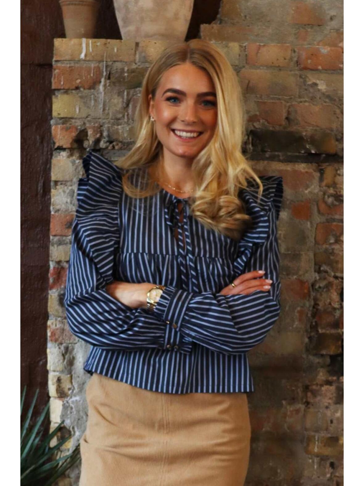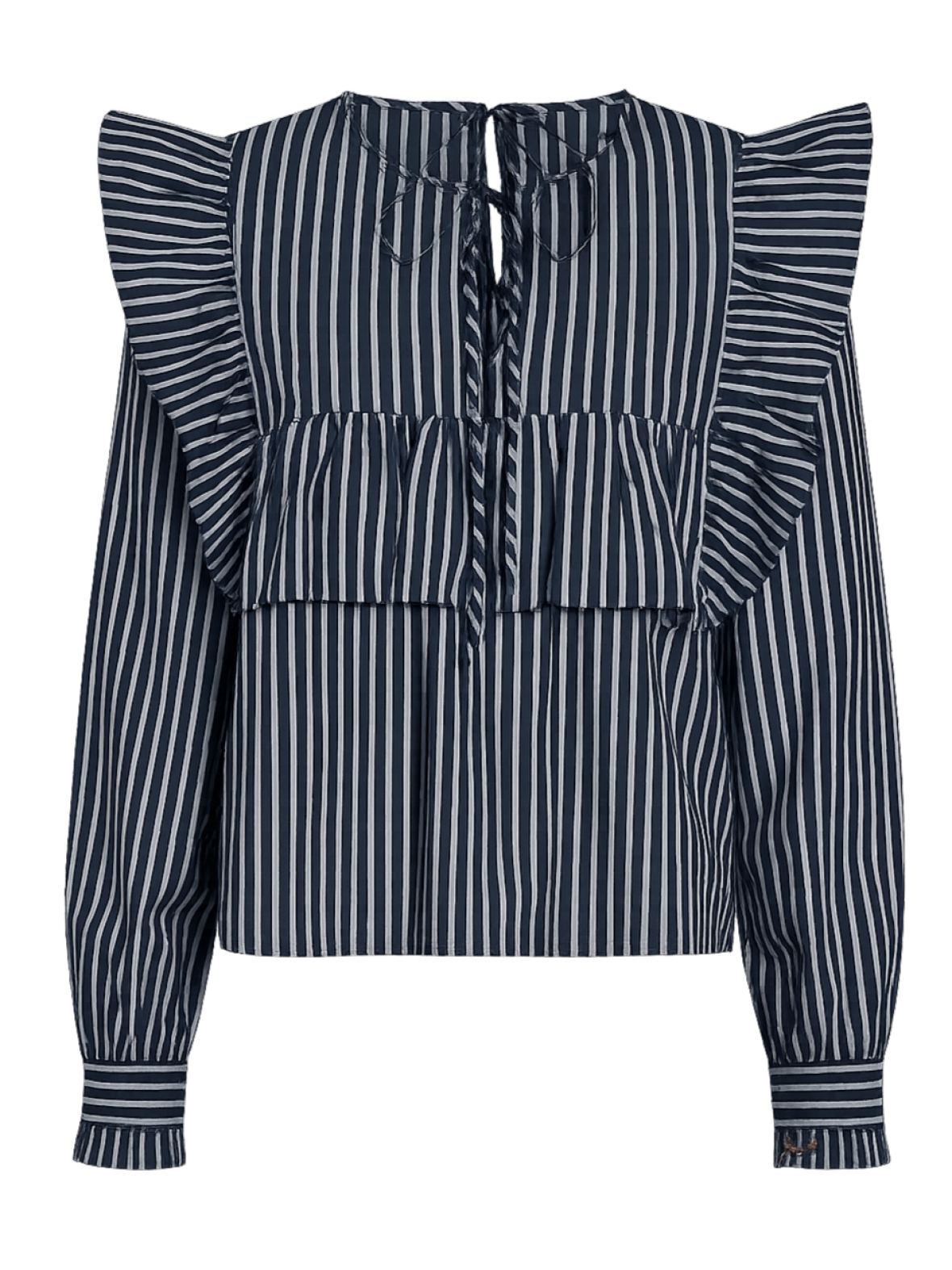 Feminin skjortebluse i marine blå med lyseblå striber. Bred flæse over skulderen der fortsætter ned foran over brystet. Slids åbning med bindebånd foran. Lange ærmer med fast manchet og knap. Lækker bomulds skjorte kvalitet, velegnet til både hverdag og mere festlige anledninger