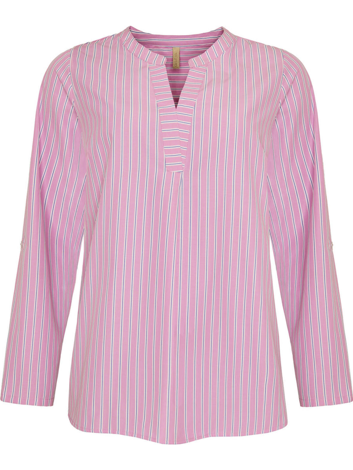 Skjorten har lange ærmer, der kan hæftes op til trekvart med trense og knap, rund hals med V-udskæring og et enkelt læg foran. Mørk pink med smalle lodrette hvide og blå striber og en afrundet kant forneden giver et blødt og elegant udtryk. Let og behagelig kvalitet kombinerer struktur fra polyester med komfort fra bomuld og en afslappet, men velafbalanceret pasform.