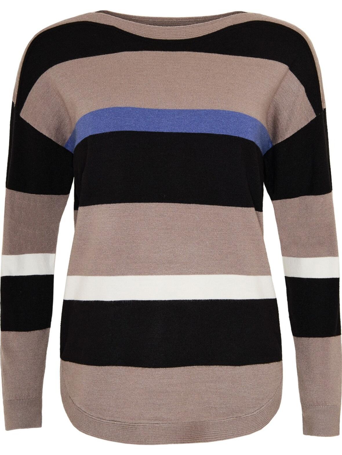 Ofelia Lullu strik pullover med båd hals og lange ærmer, vandret stribet i sand, offwhite, jeansblå og sort. En rolig og feminin basestrik til sæsonen.