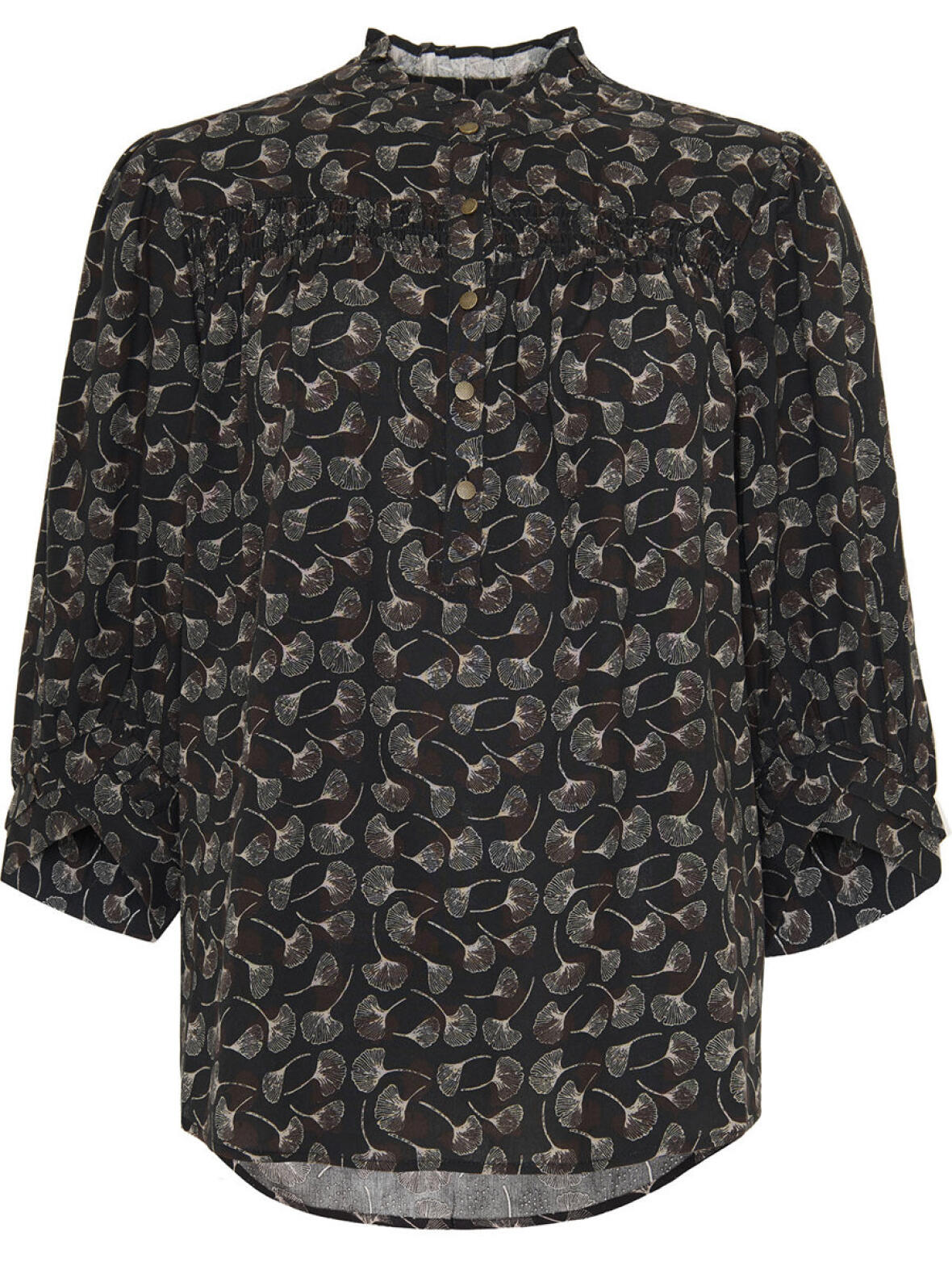Hilla skjorte/bluse fra Ofelia i mørk brun med et blidt bladmotiv.