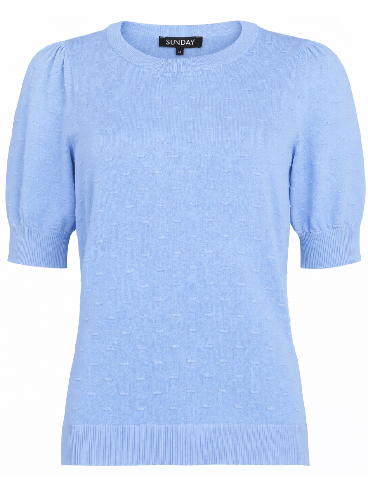 Lyseblå strik fra Sunday. En let og feminin bluse med rund hals og korte ærmer, ideel til hverdagsgarderoben.